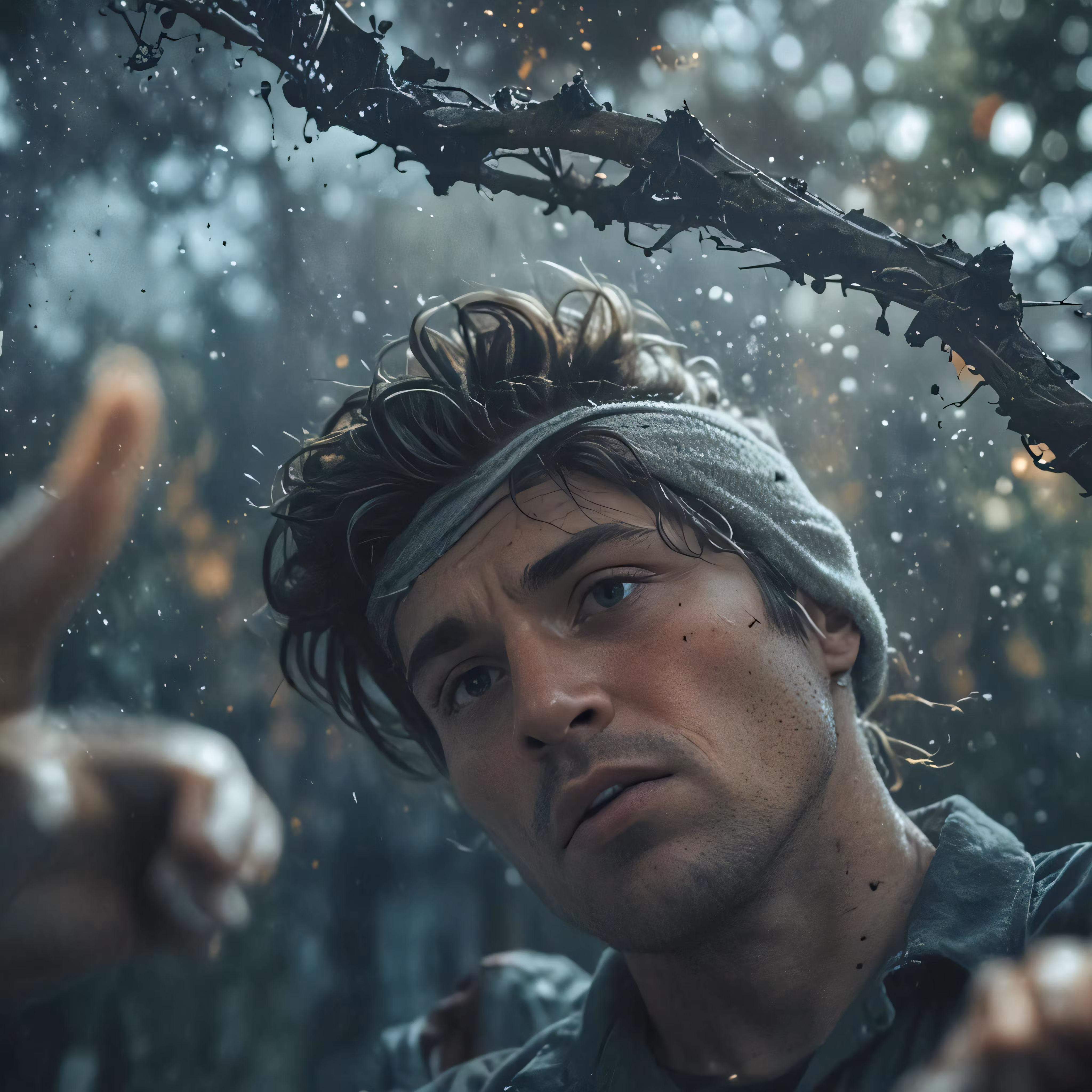 High resolution picture, free to use, man standing in rain wearing bandanna and gloves