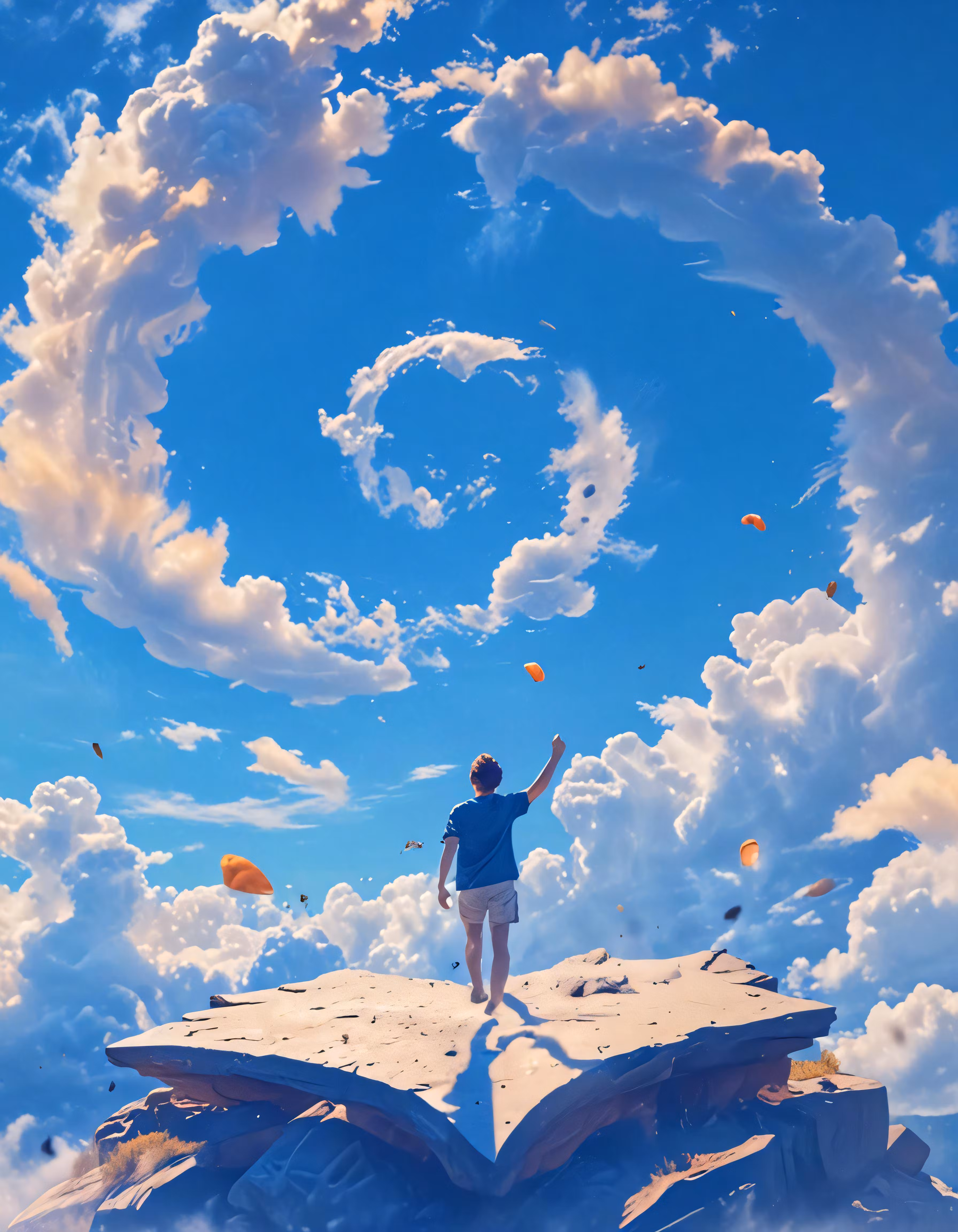 High resolution picture, free to use, man standing on open book in front of clouds and sky
