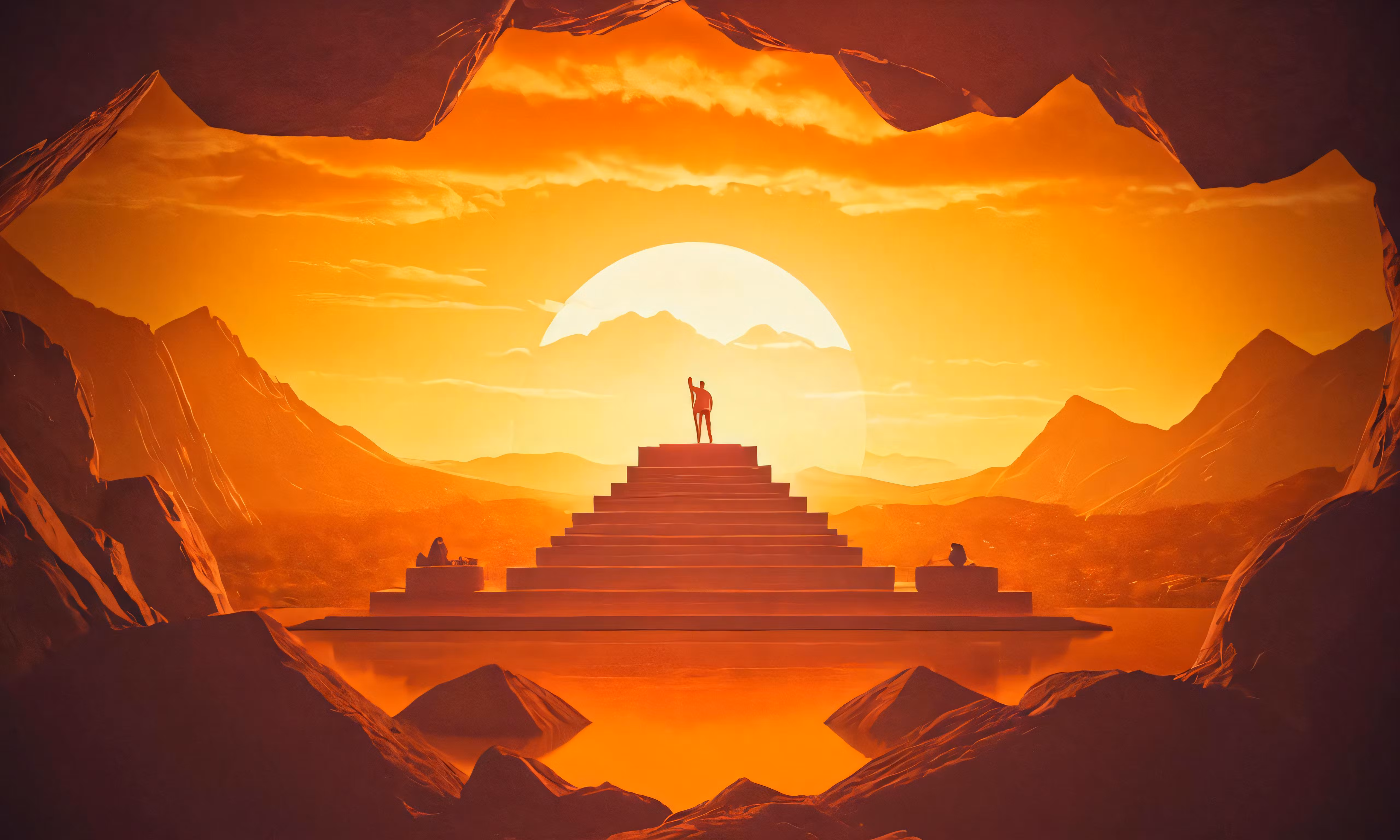 High resolution picture, free to use, man standing on pyramid overlooking a lake at sunset