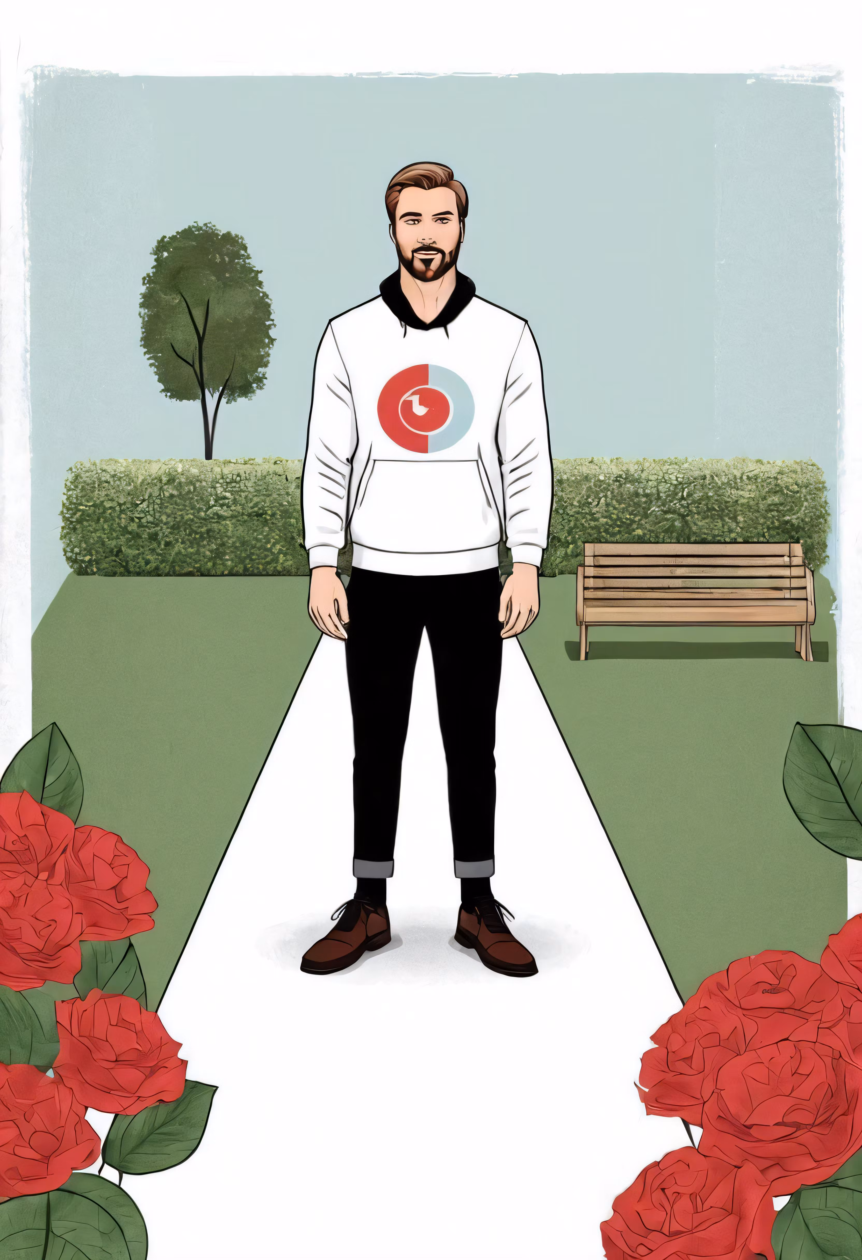 High resolution picture, free to use, man standing on white carpet in front of red flowers