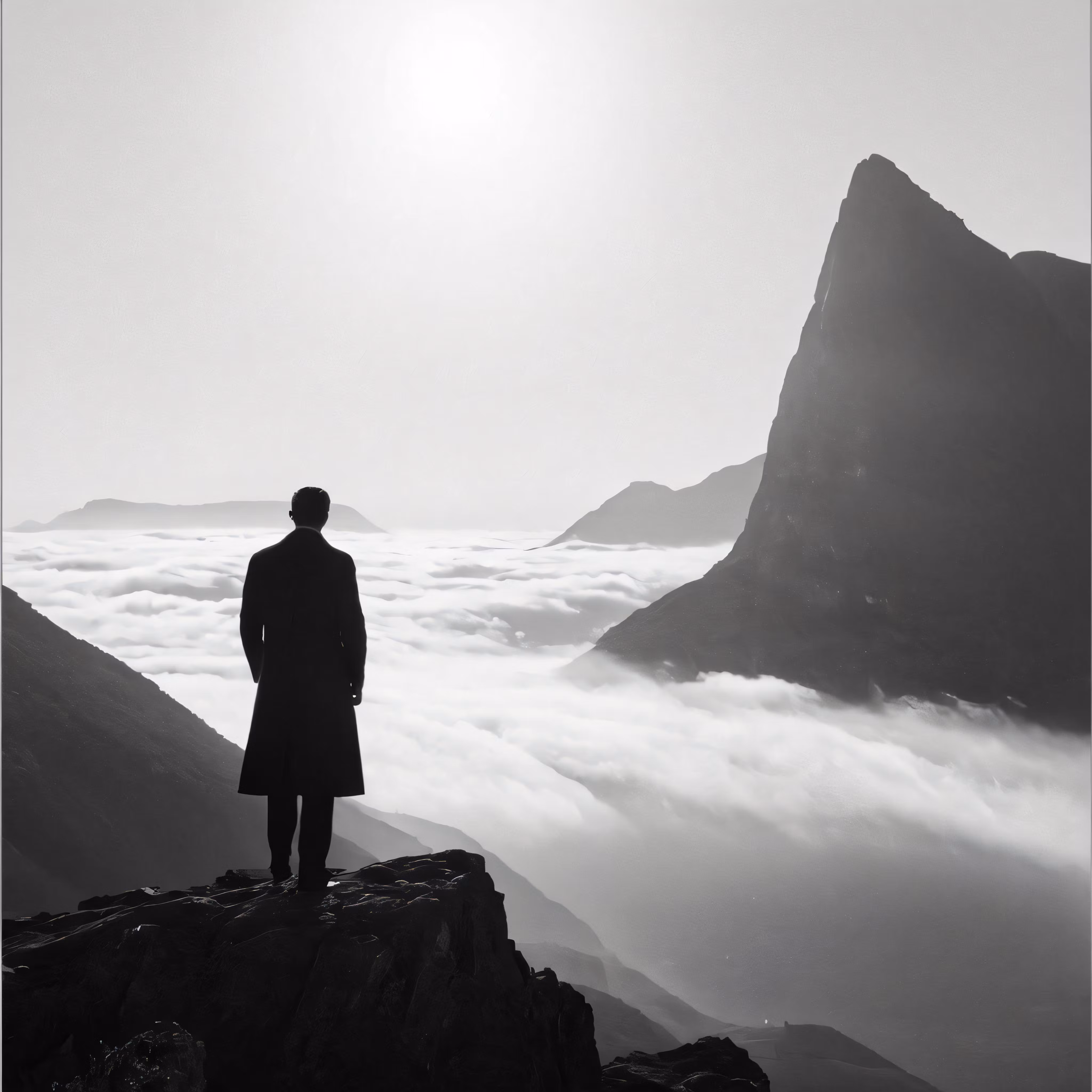 High resolution picture, free to use, man stands on top of mountain looking out at the clouds