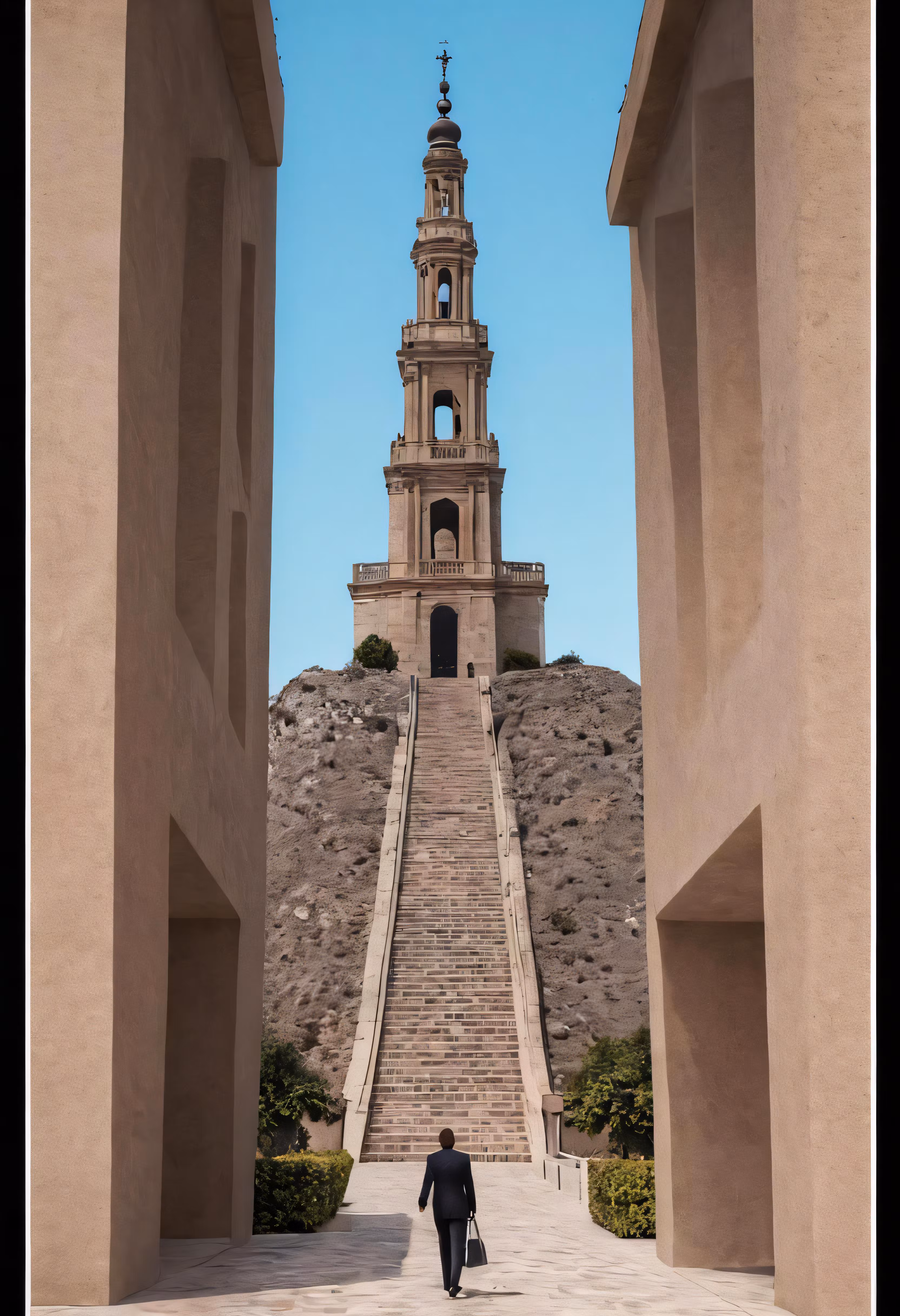 High resolution picture, free to use, man walking down stairs in front of steeple with steeple tower