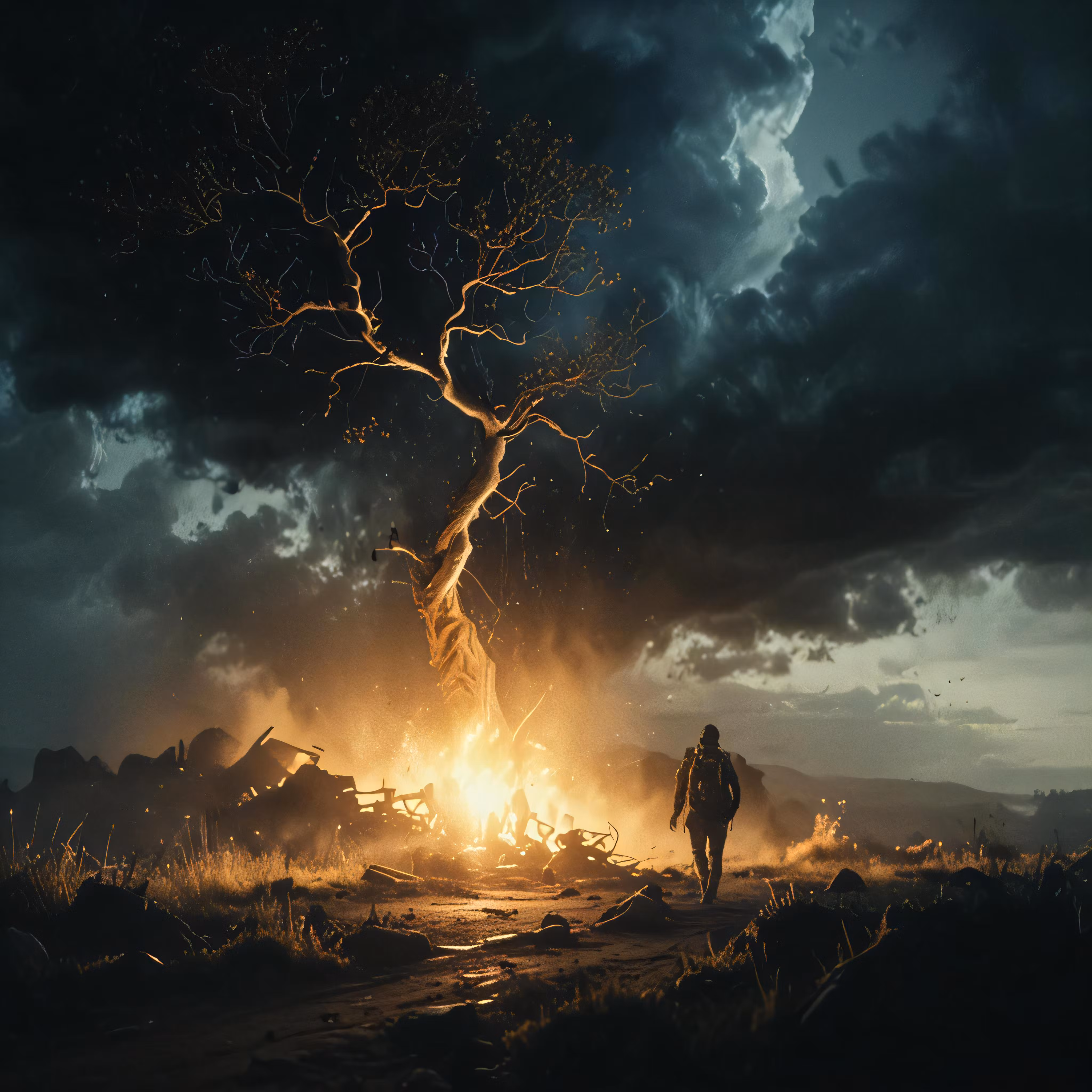 High resolution picture, free to use, man walking toward burning structure under cloudy skies