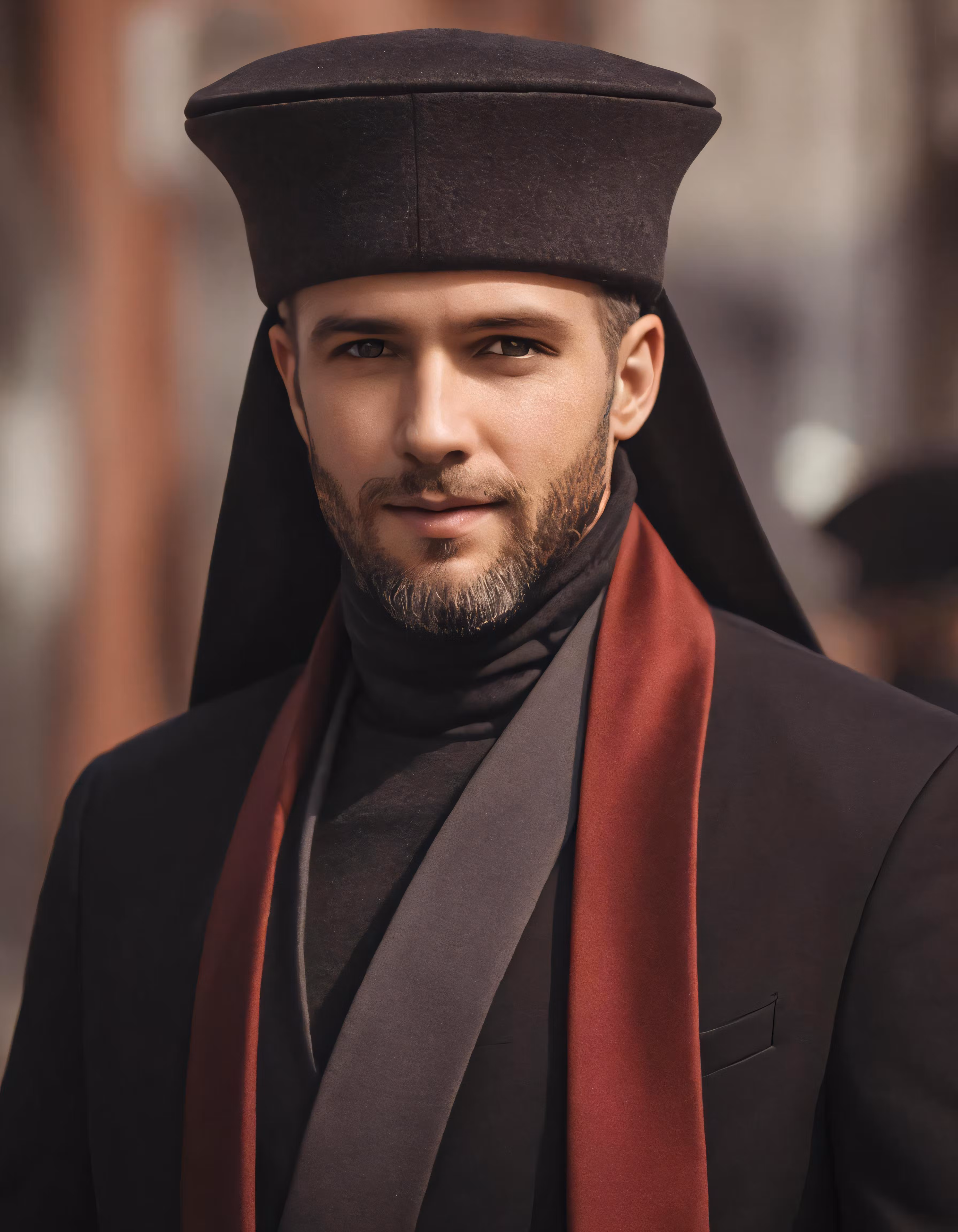 High resolution picture, free to use, man with beard and mustache in black suit with red neck tie