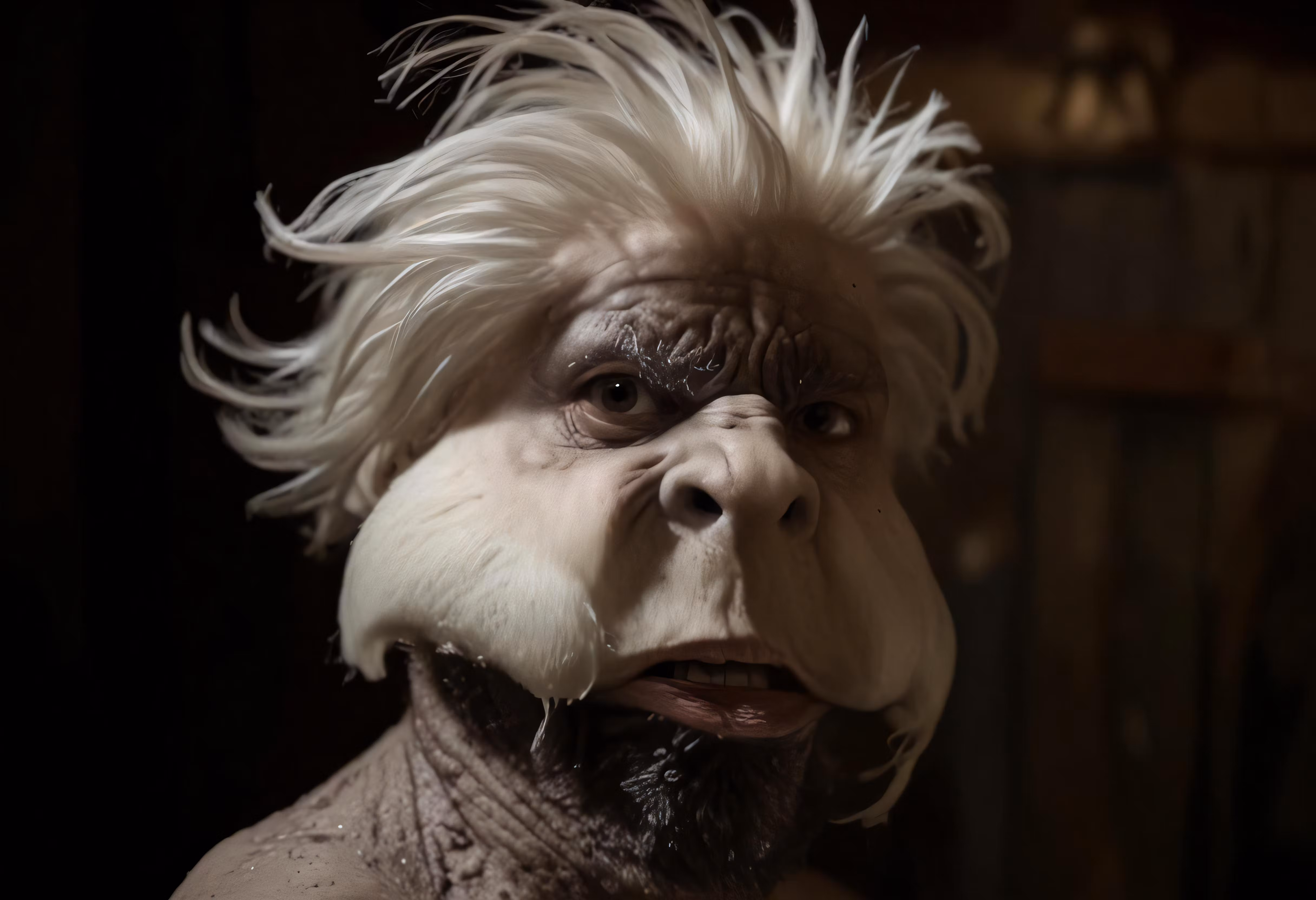 High resolution picture, free to use, man with hair and makeup on body of creature in dark room