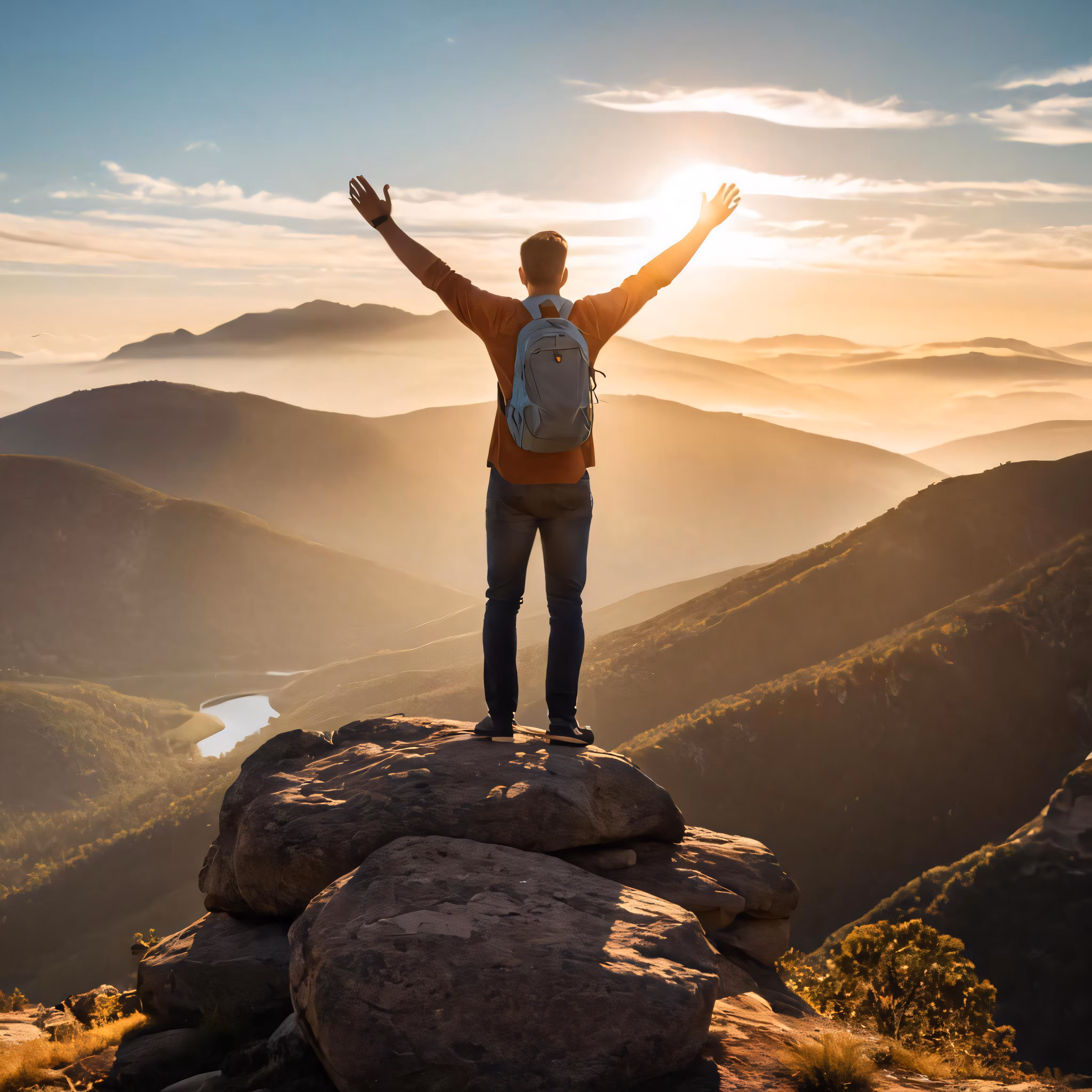 High resolution picture, free to use, man with his hands up, on top of a mountain