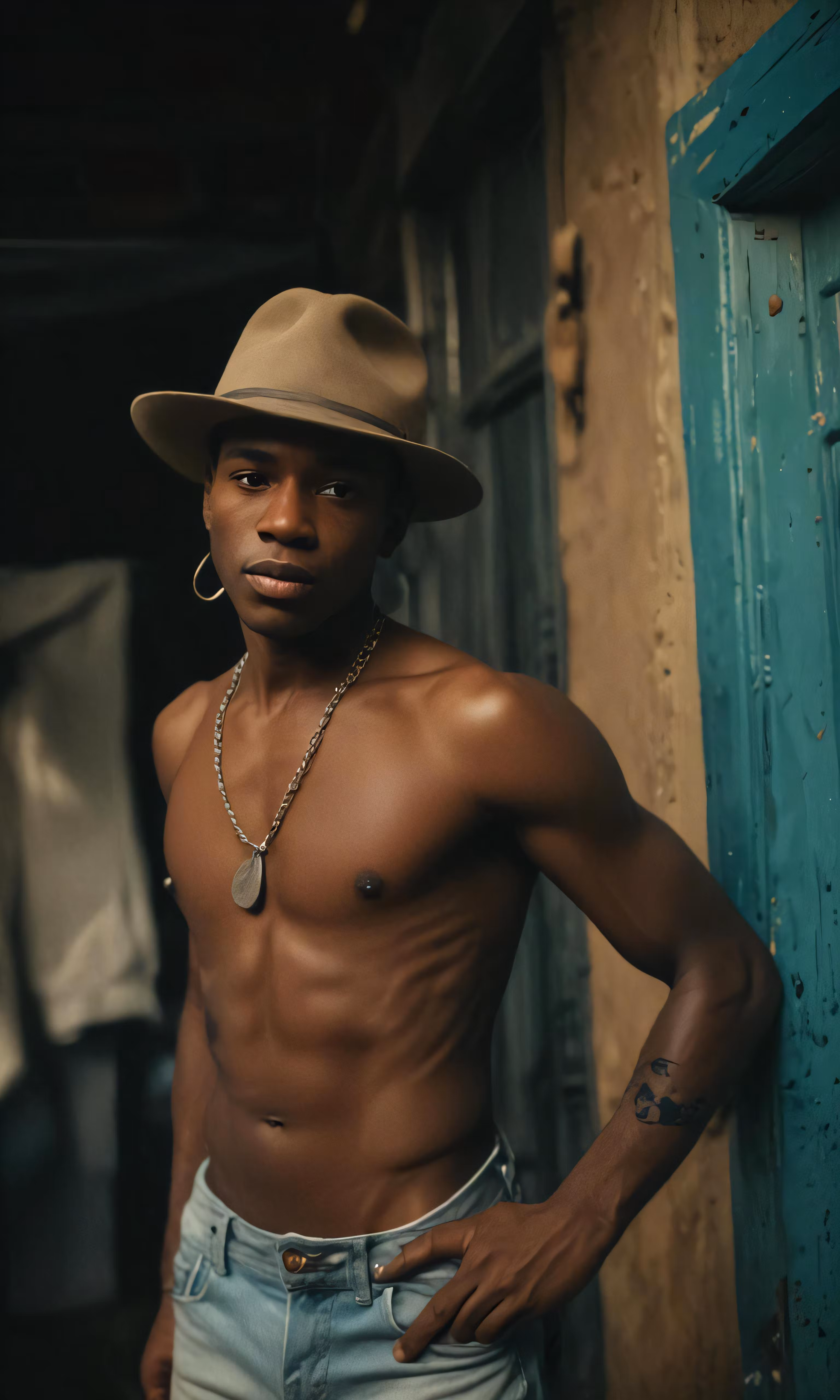 High resolution picture, free to use, man with no shirt and a hat leaning against the wall