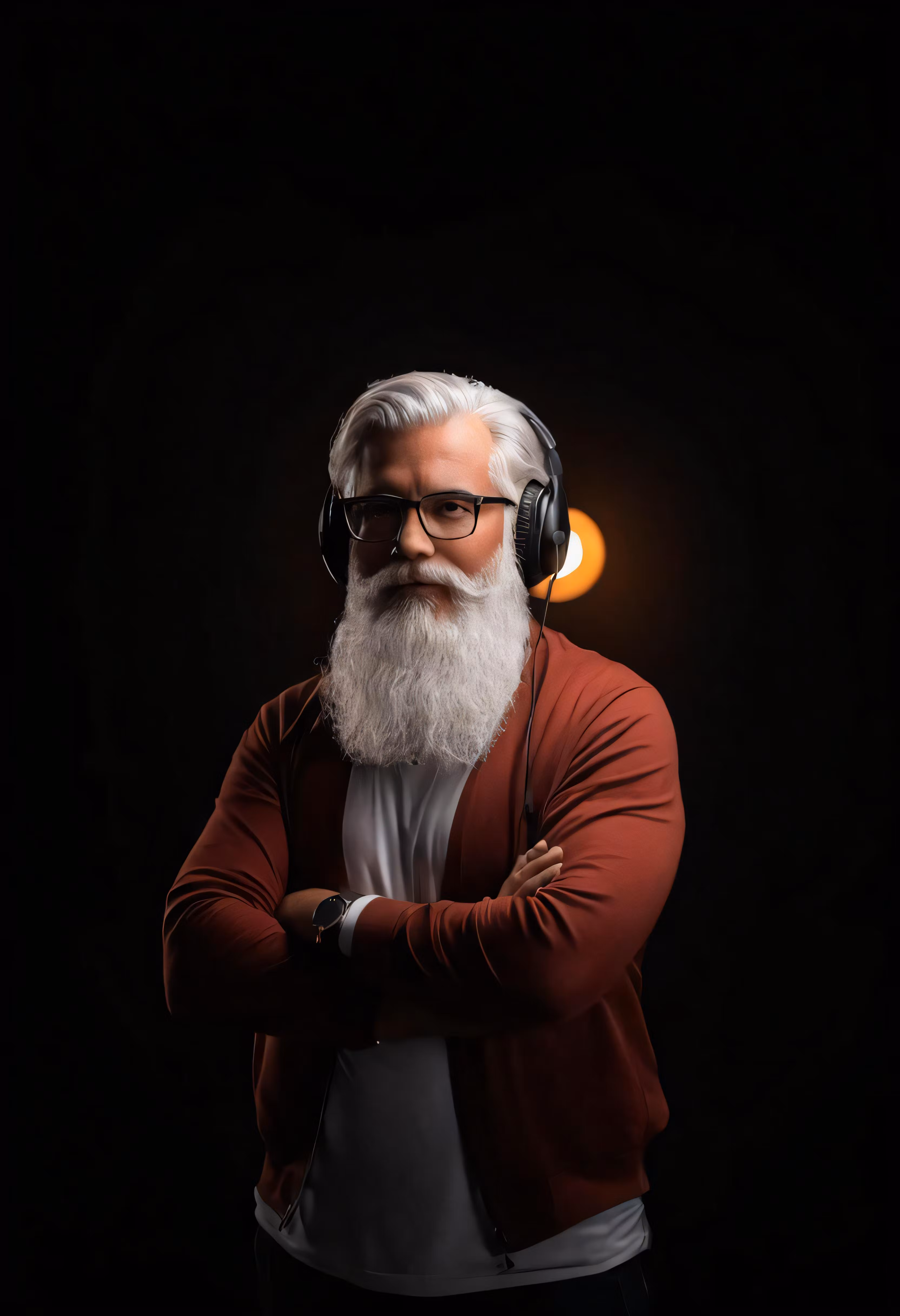 High resolution picture, free to use, man with white beard wearing headphones and red jacket