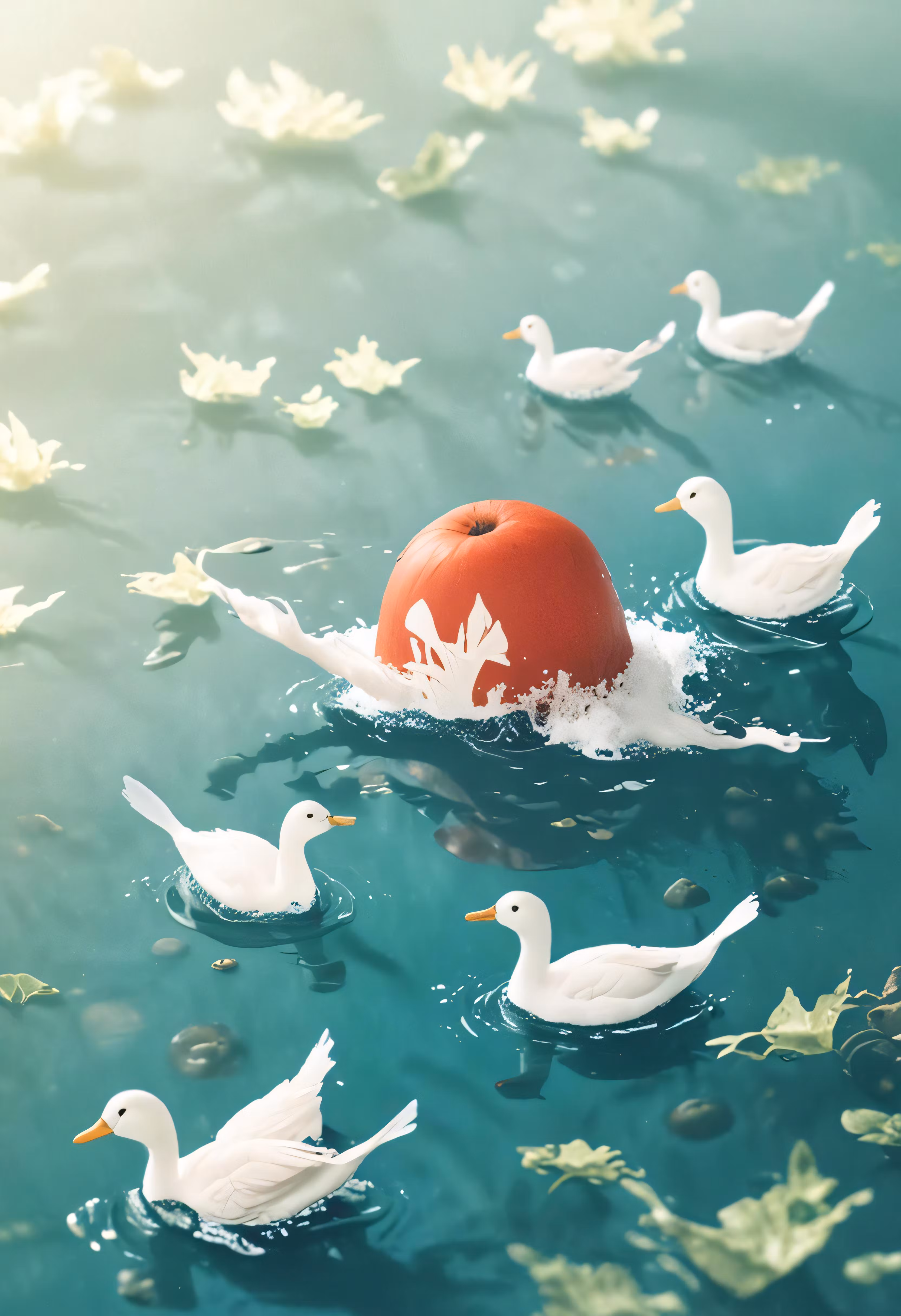 High resolution picture, free to use, many birds floating on some water with a red tomato in it