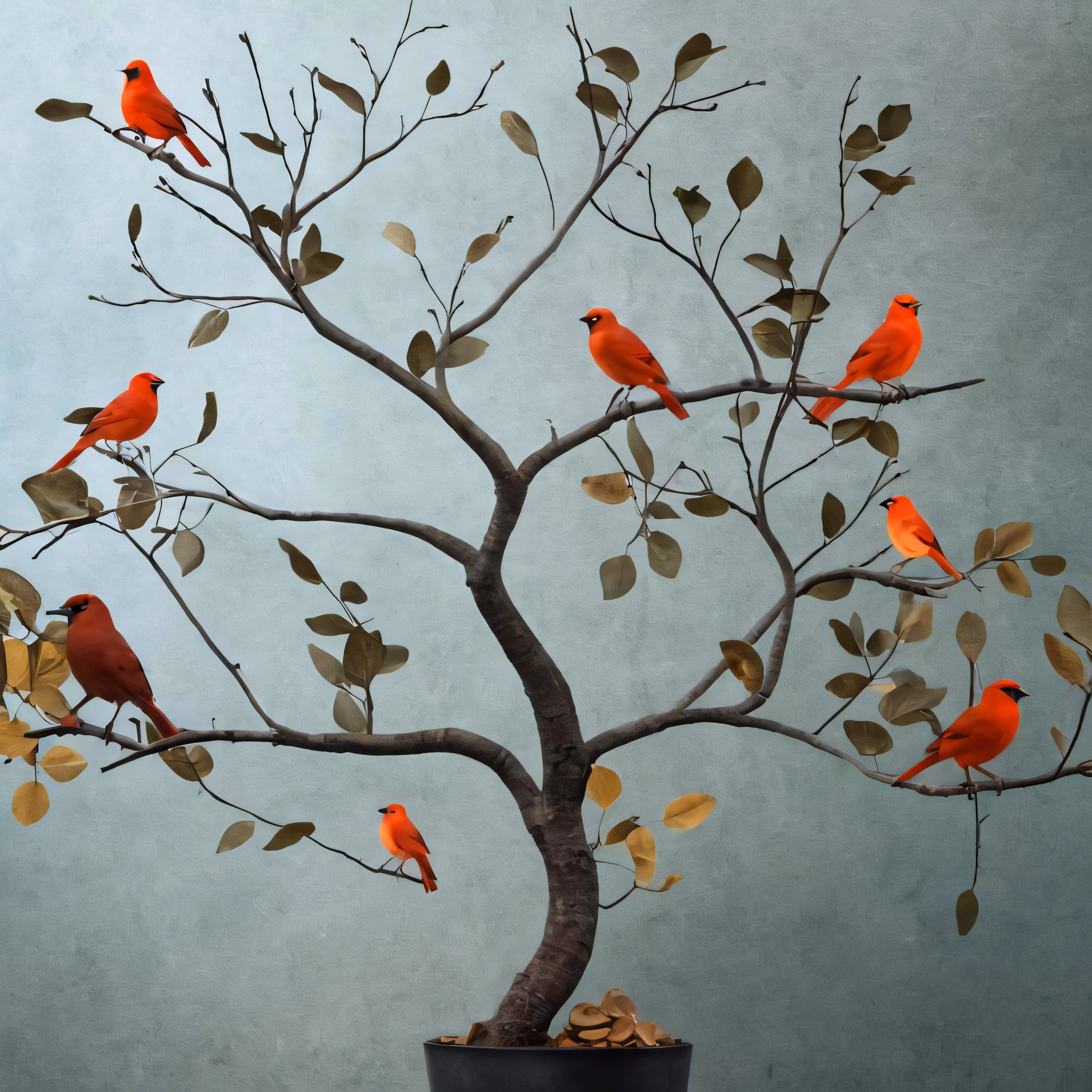 High resolution picture, free to use, many birds on a tree in a room with light gray walls