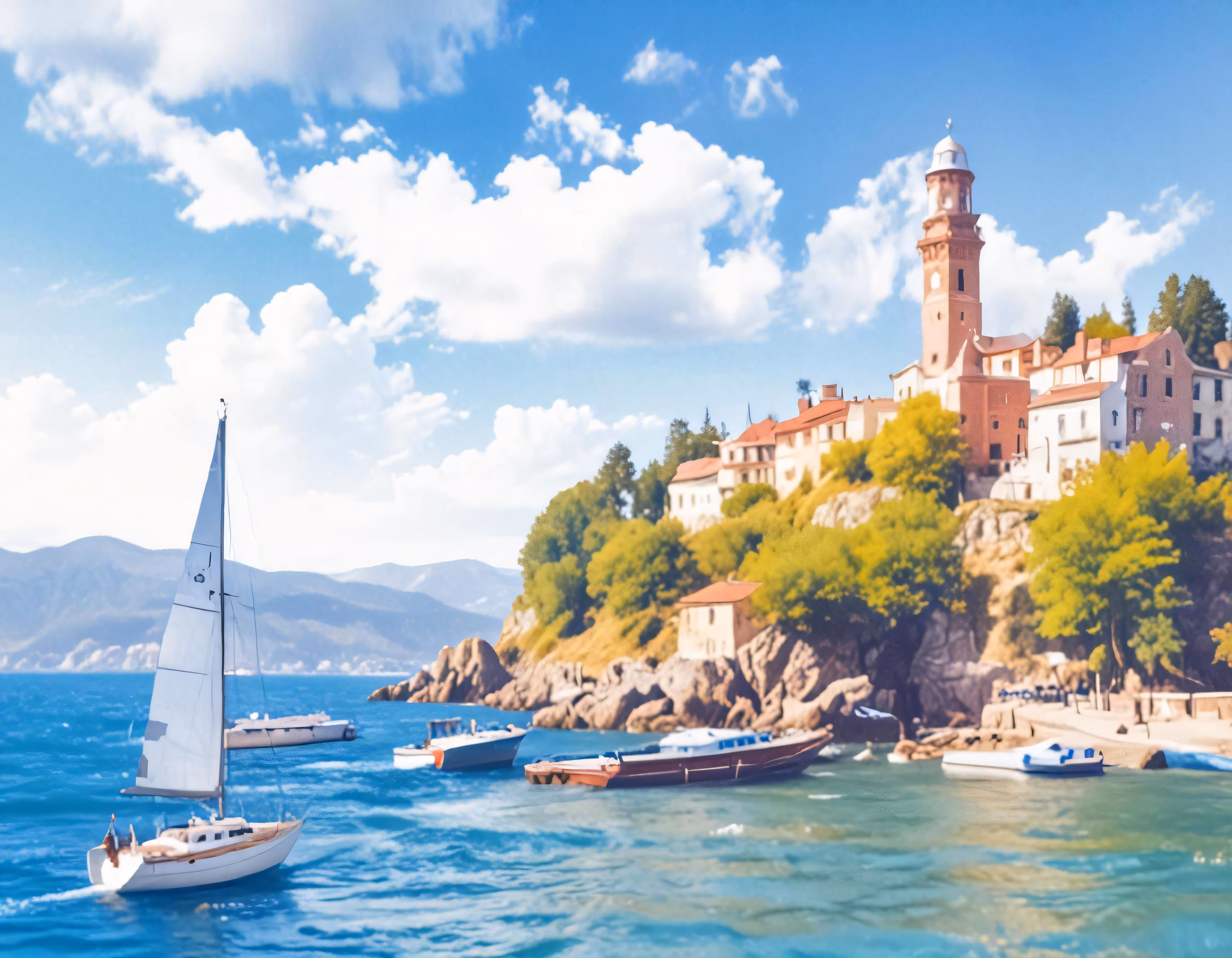 High resolution picture, free to use, many boats and a sailboat in a body of water