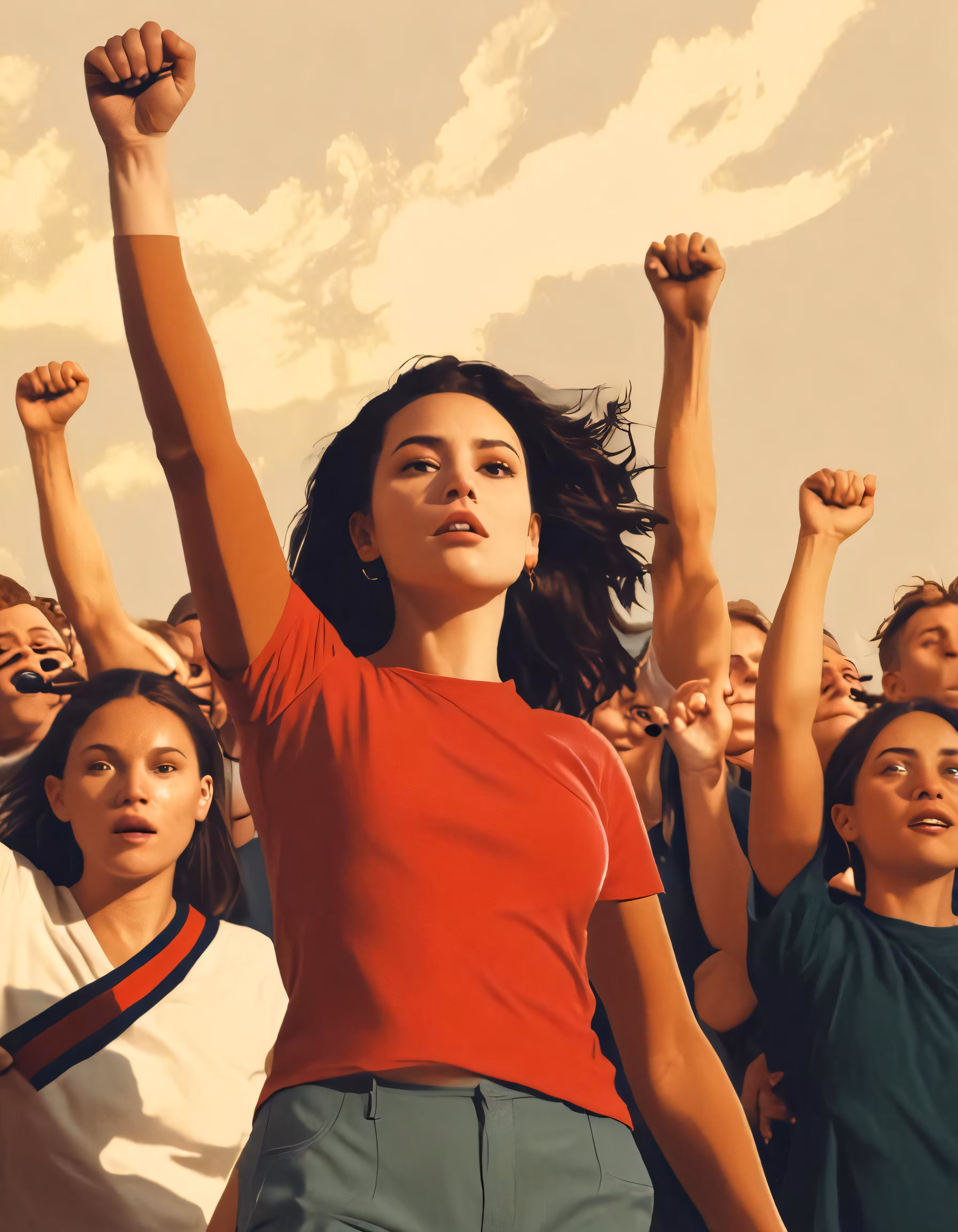 High resolution picture, free to use, many children are standing outside with their arms in the air