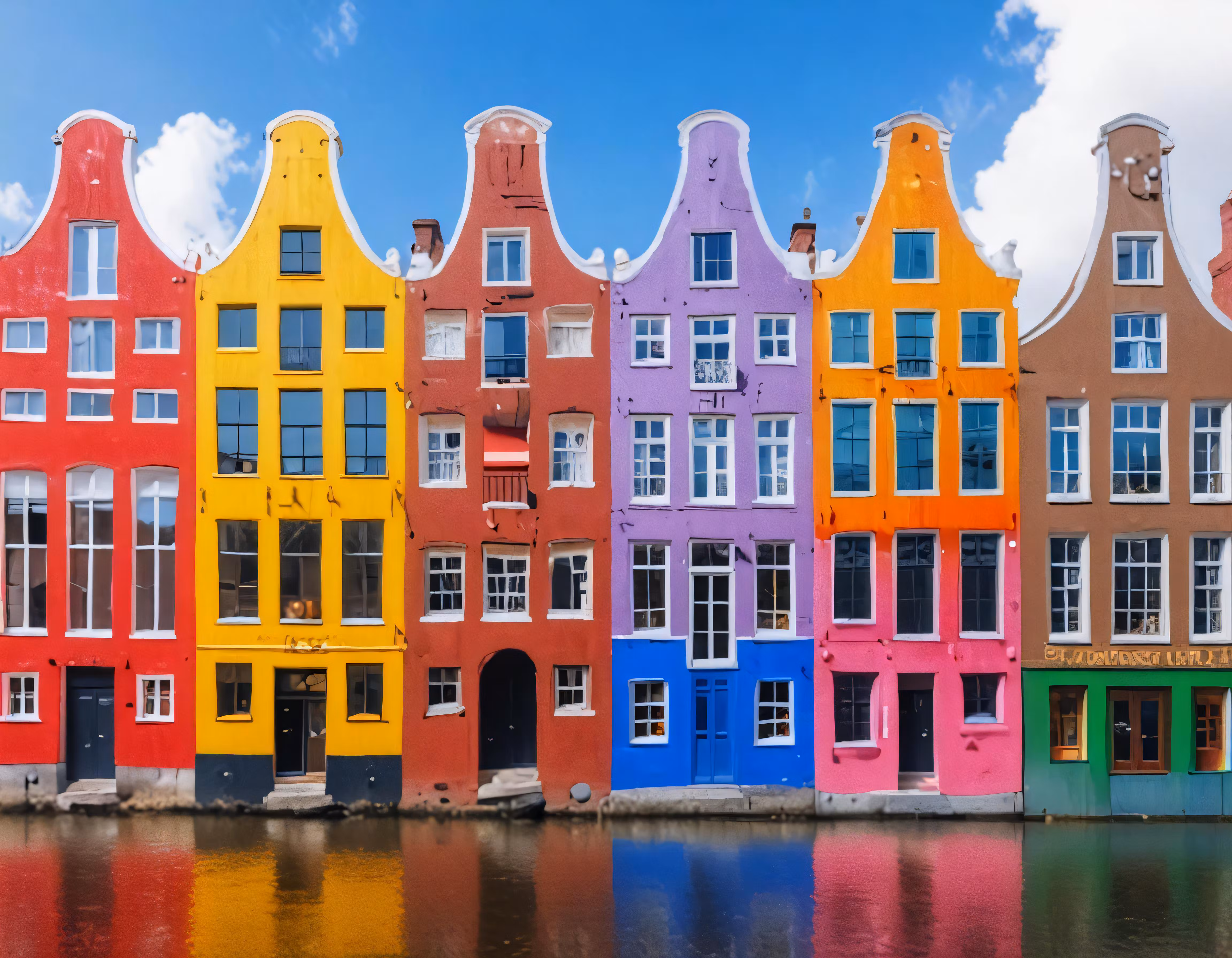 High resolution picture, free to use, many colorful buildings and water reflecting the surrounding area