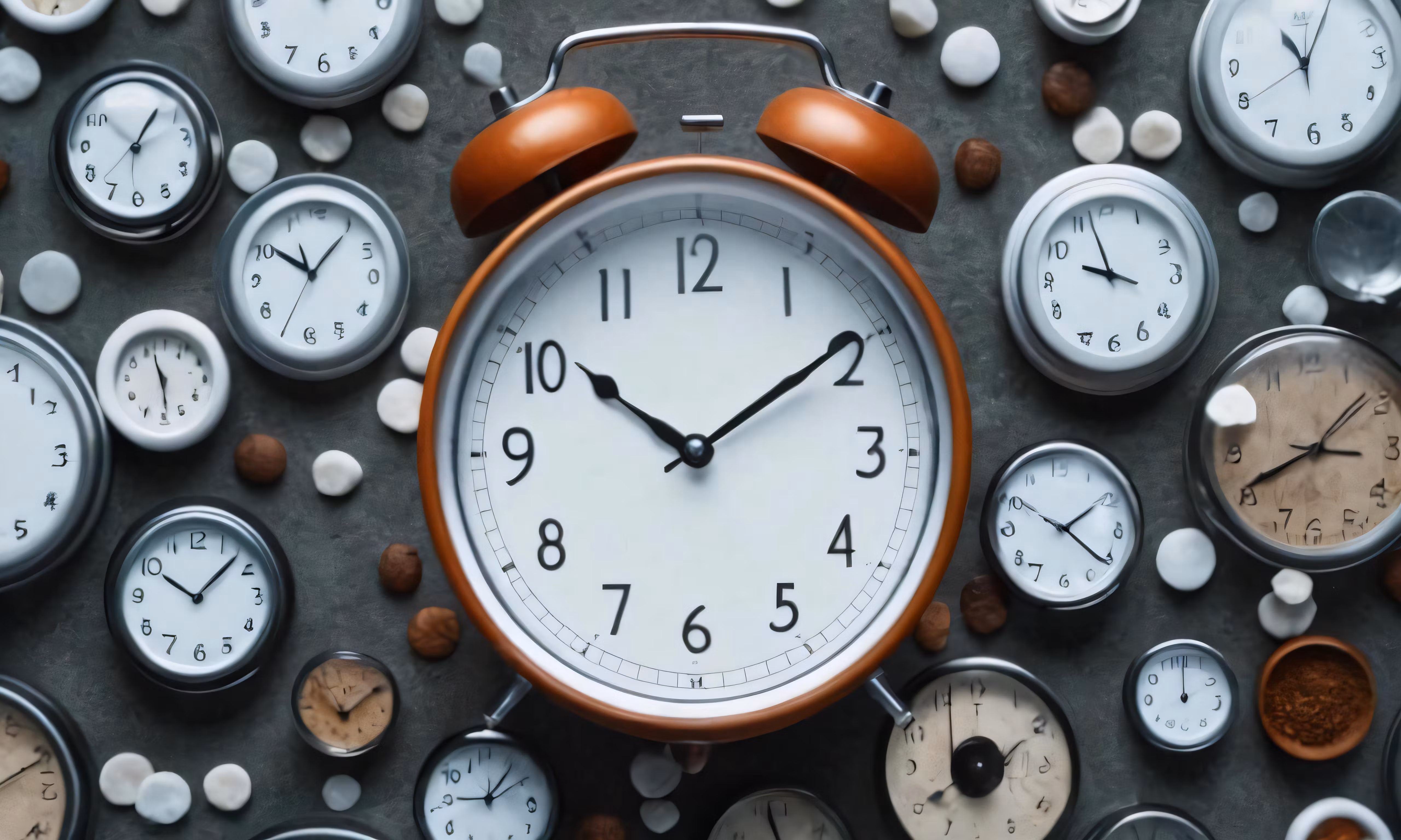 High resolution picture, free to use, many different clocks and nuts scattered around it