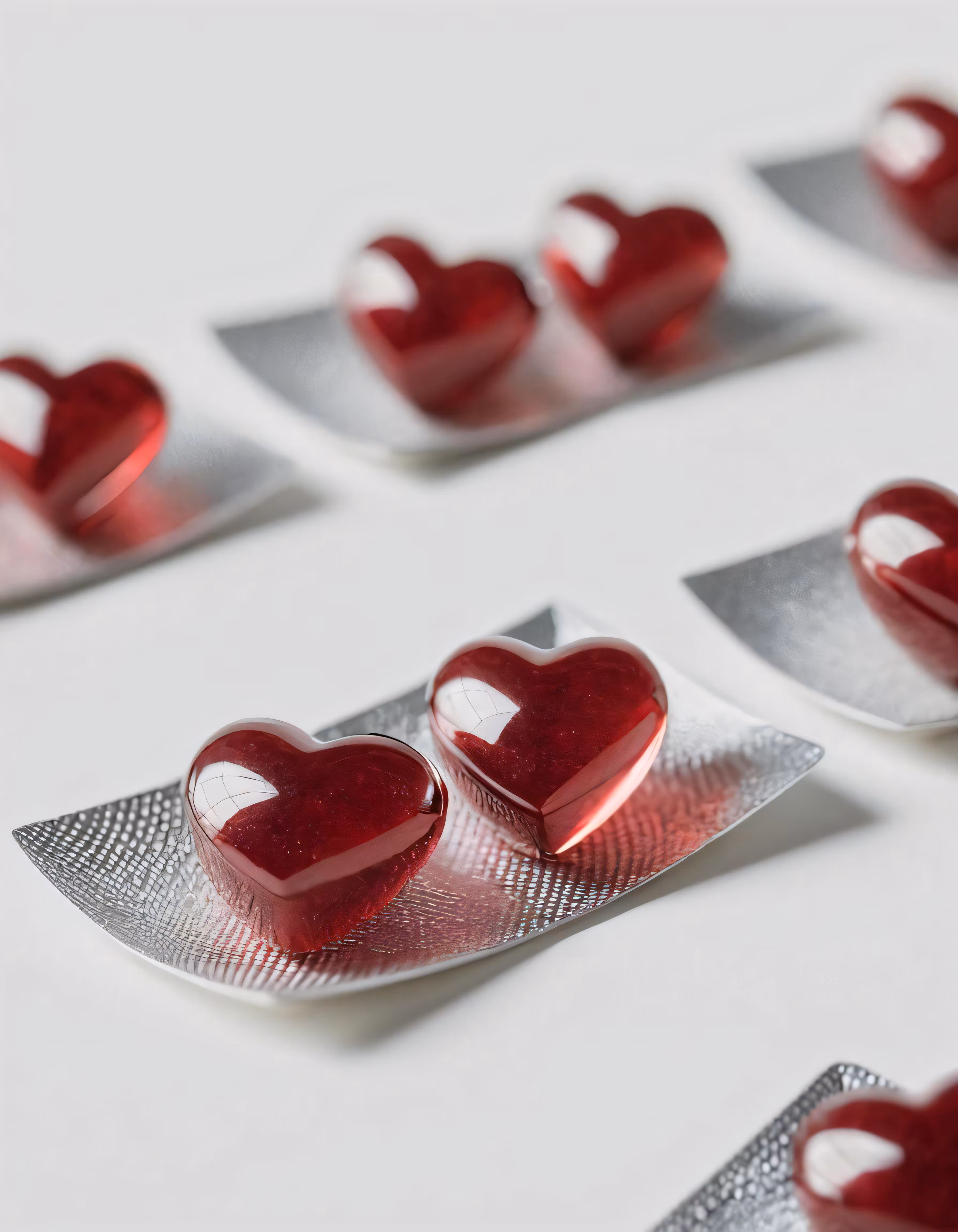High resolution picture, free to use, many red hearts are on silver plates, on a table