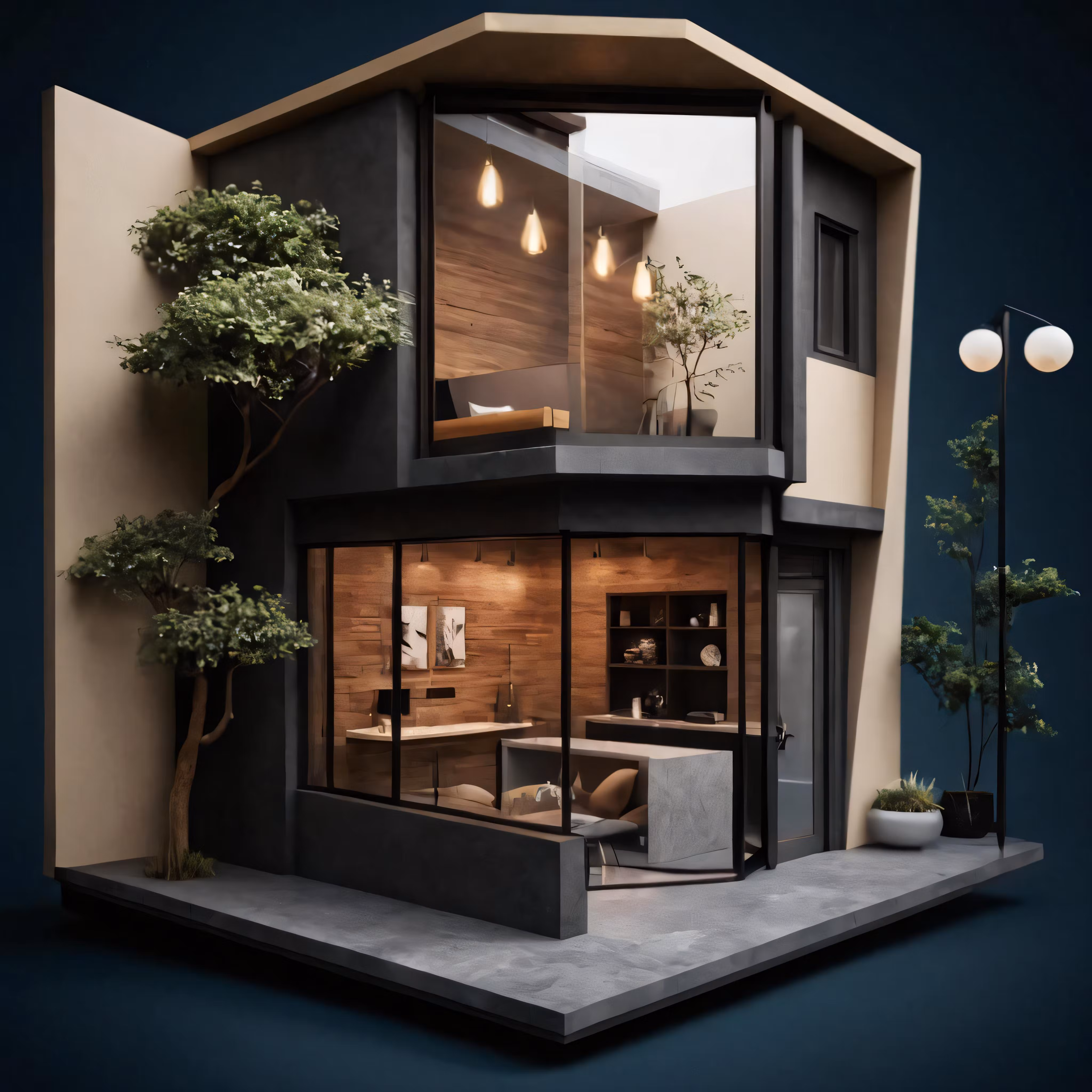 High resolution picture, free to use, modern house with trees and lights on the outside