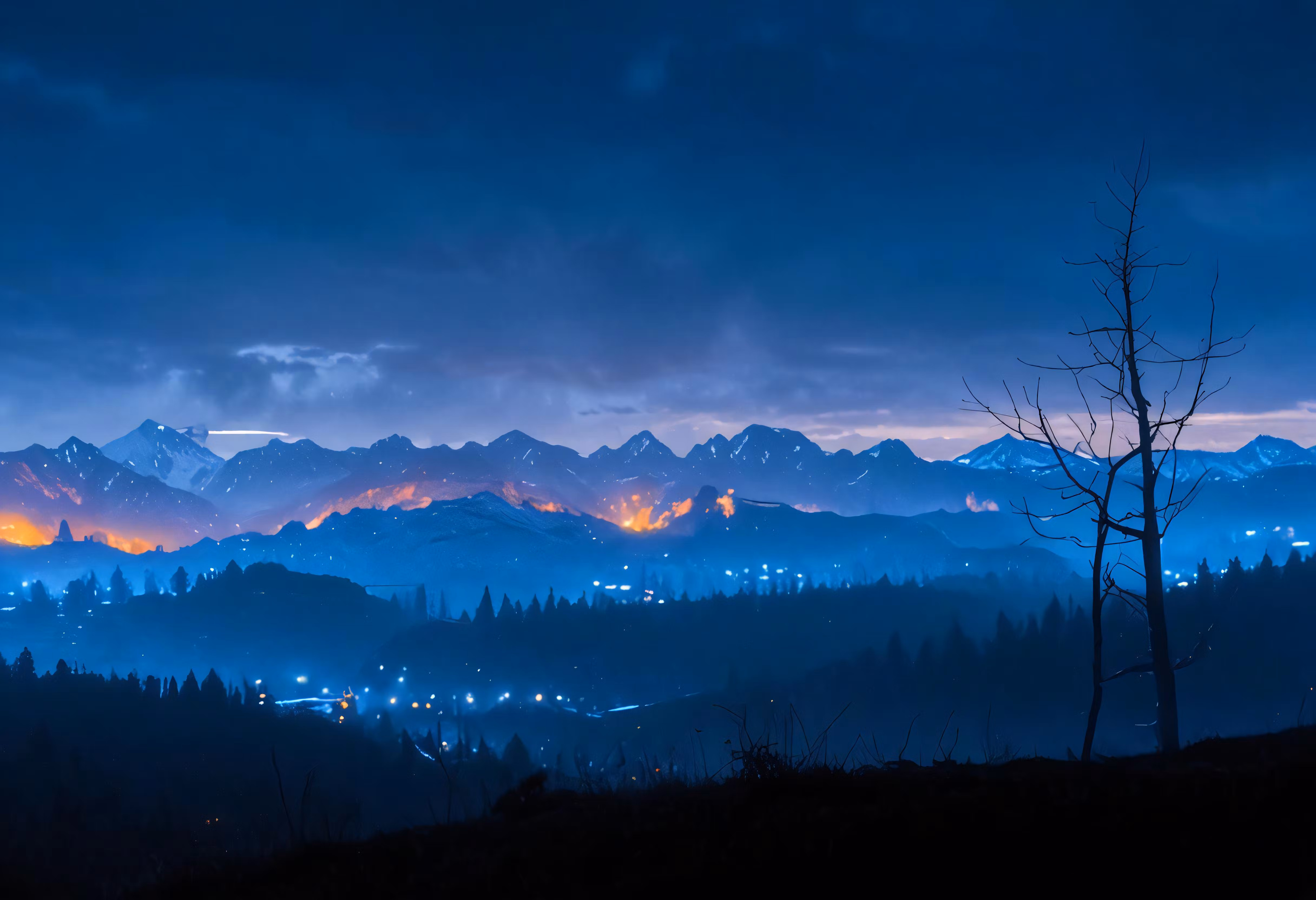High resolution picture, free to use, mountains in the distance with buildings lit up
