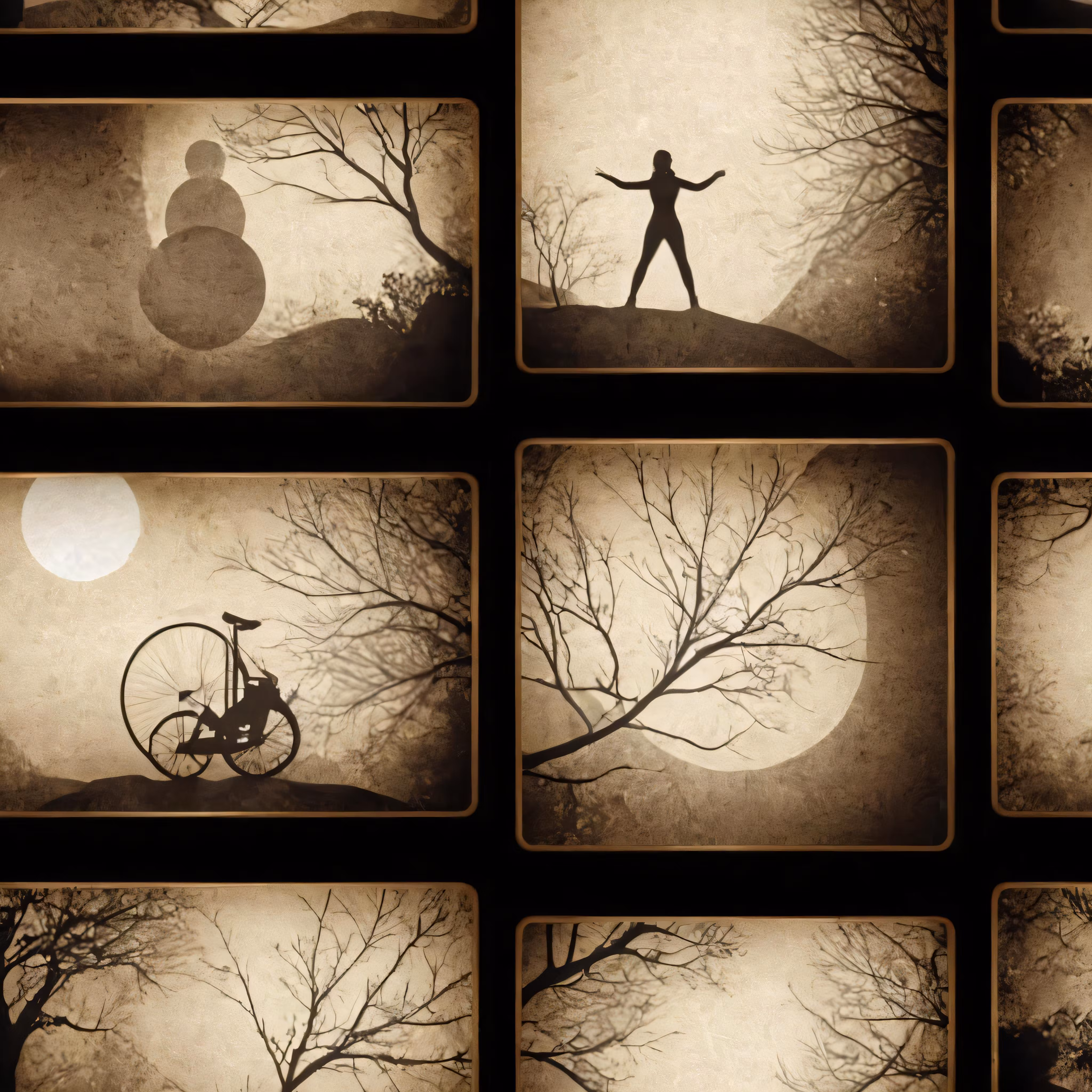 High resolution picture, free to use, multiple images of a silhouette of someone with their bike