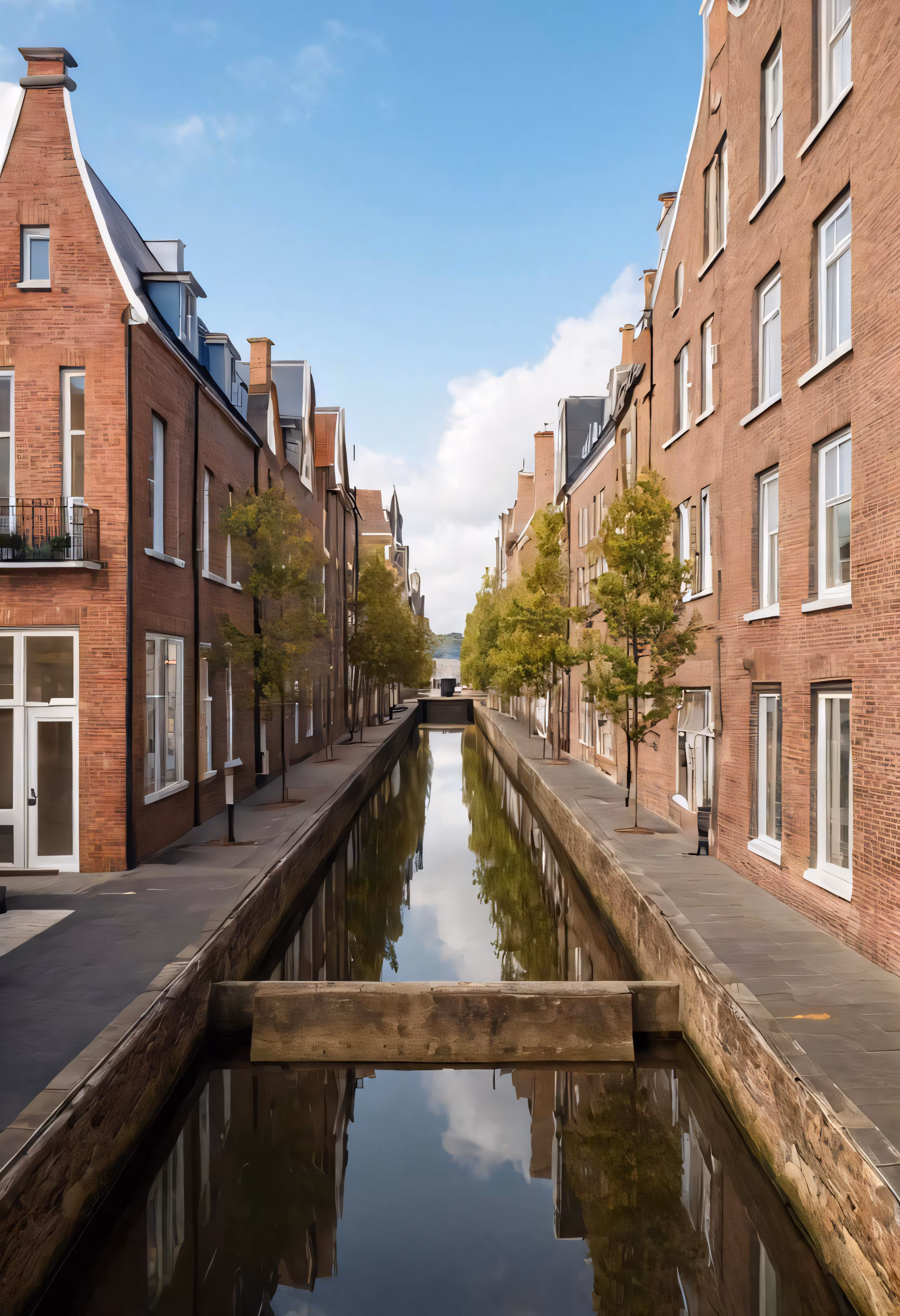High resolution picture, free to use, narrow canal in bricked city by red brick buildings