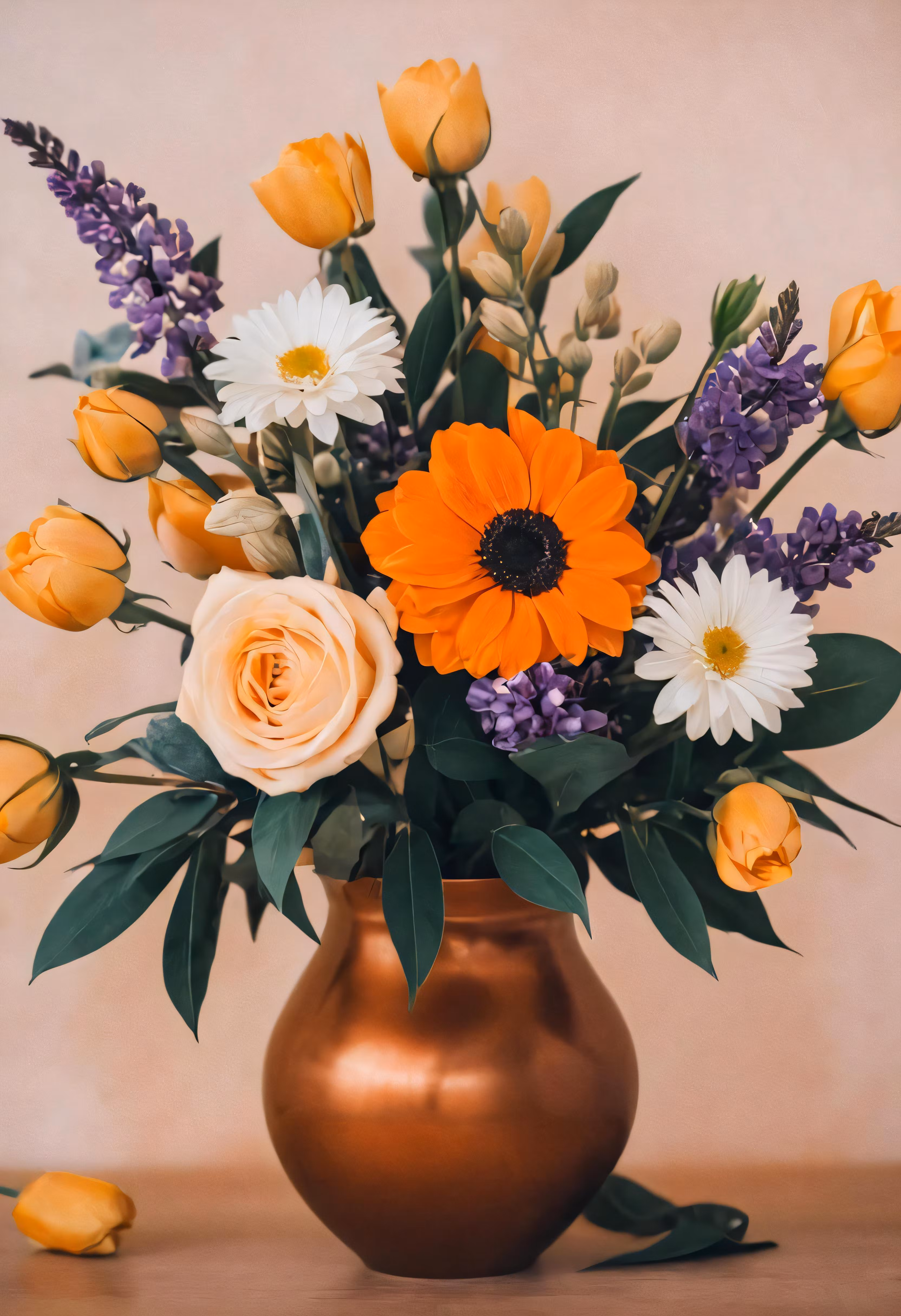 High resolution picture, free to use, orange and white flowers in a vase with yellow tulips