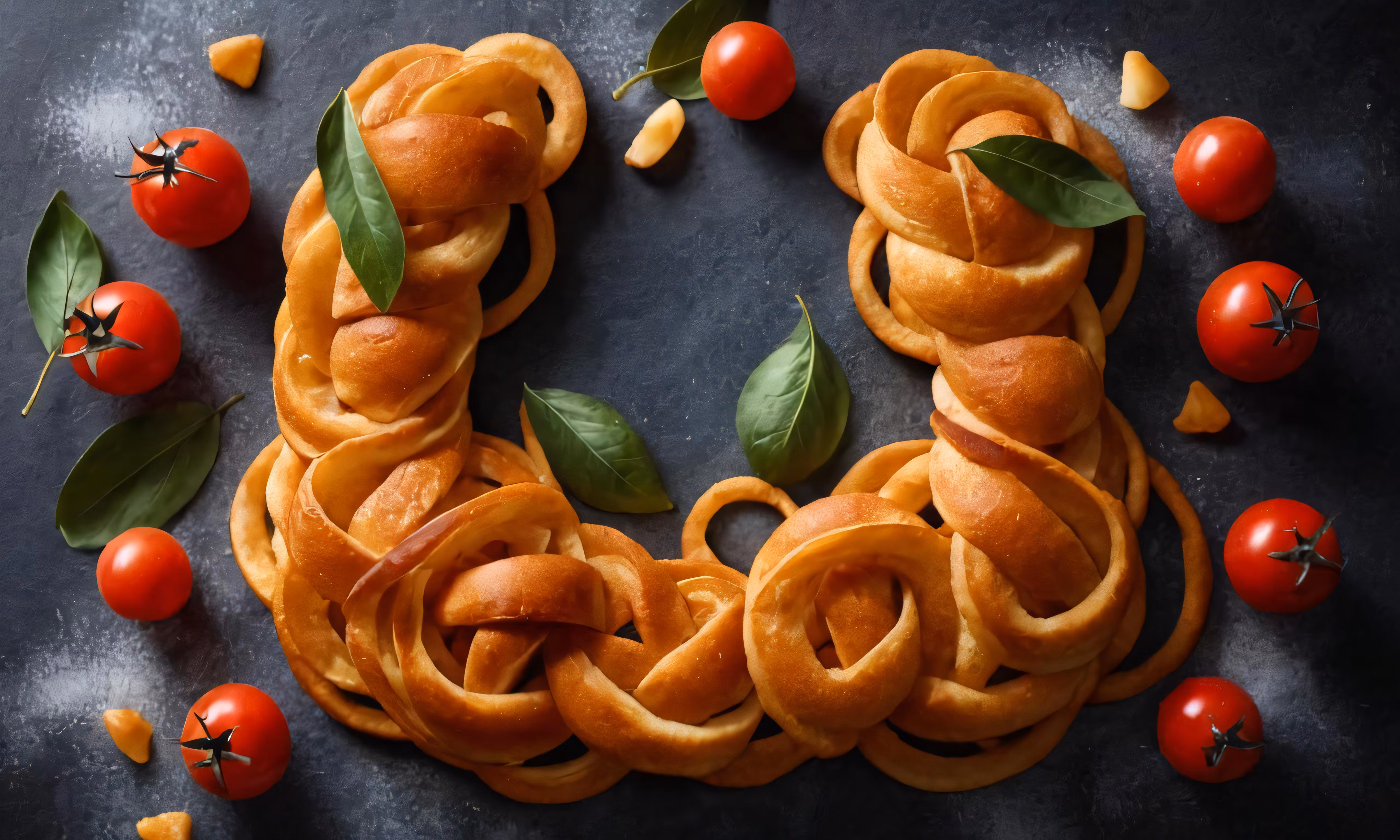 High resolution picture, free to use, pasta spirals are arranged as leaves, tomatoes and tomatoes on the table