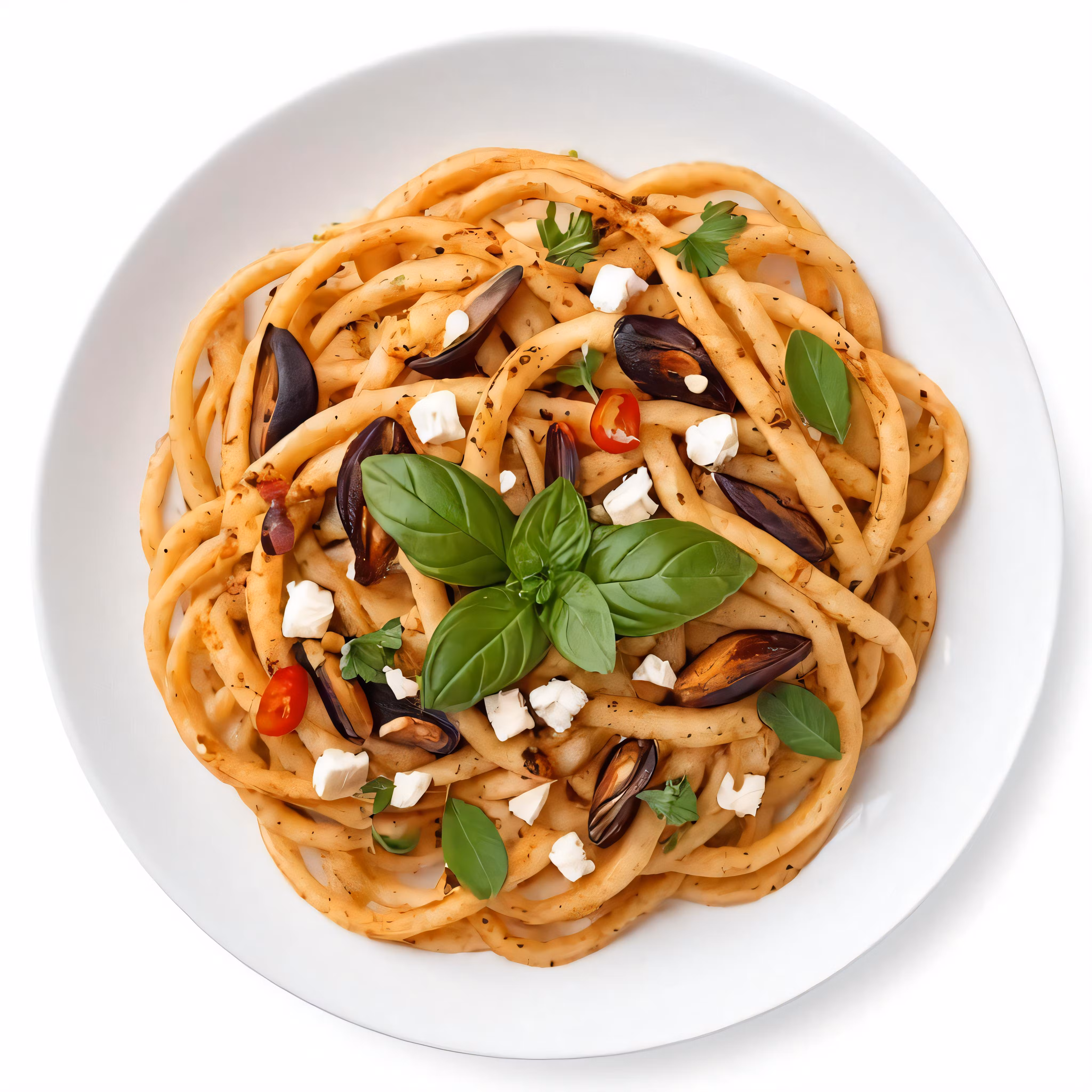 High resolution picture, free to use, pasta with fresh basil, olives and feta cheese