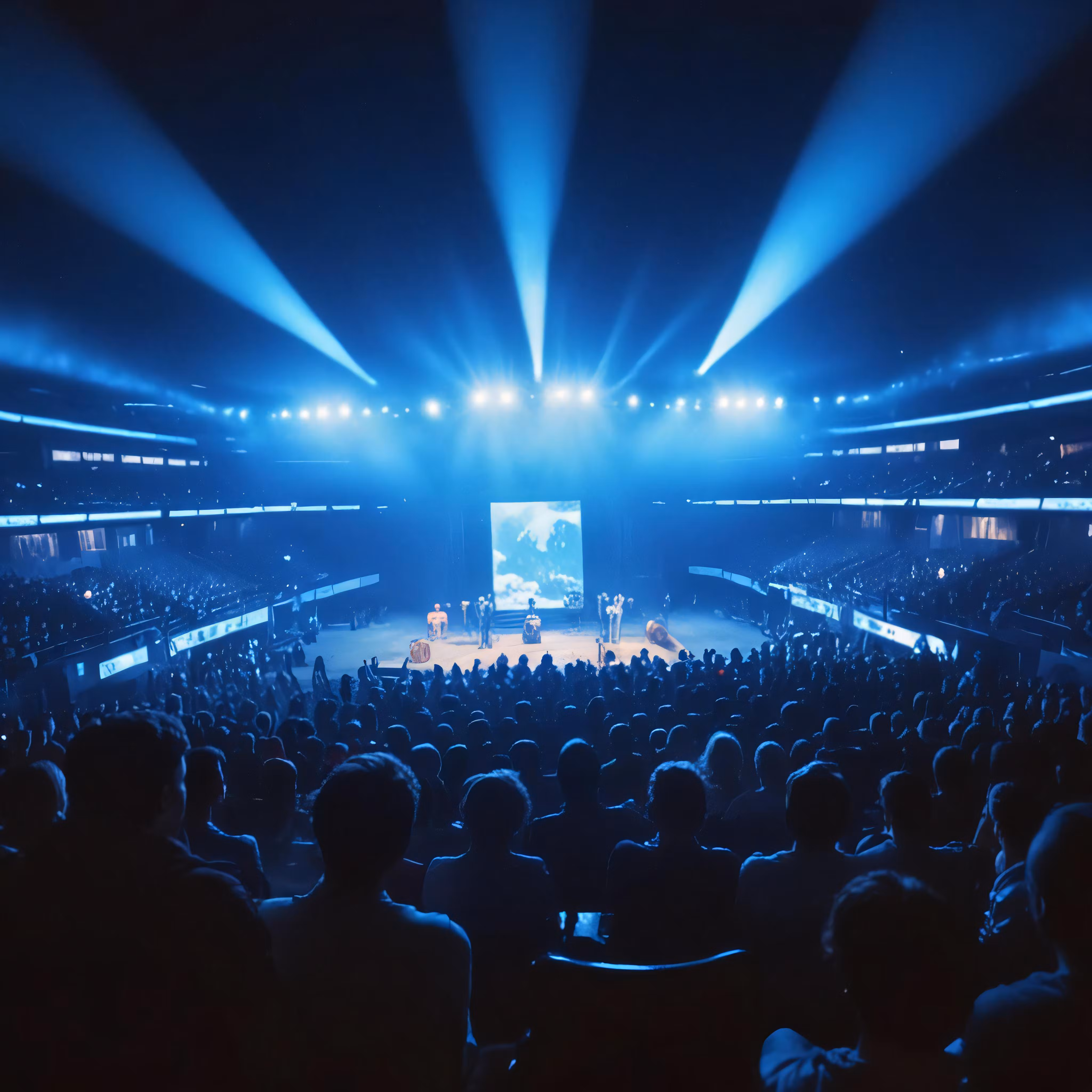 High resolution picture, free to use, people are sitting at chairs in an arena watching a stage show