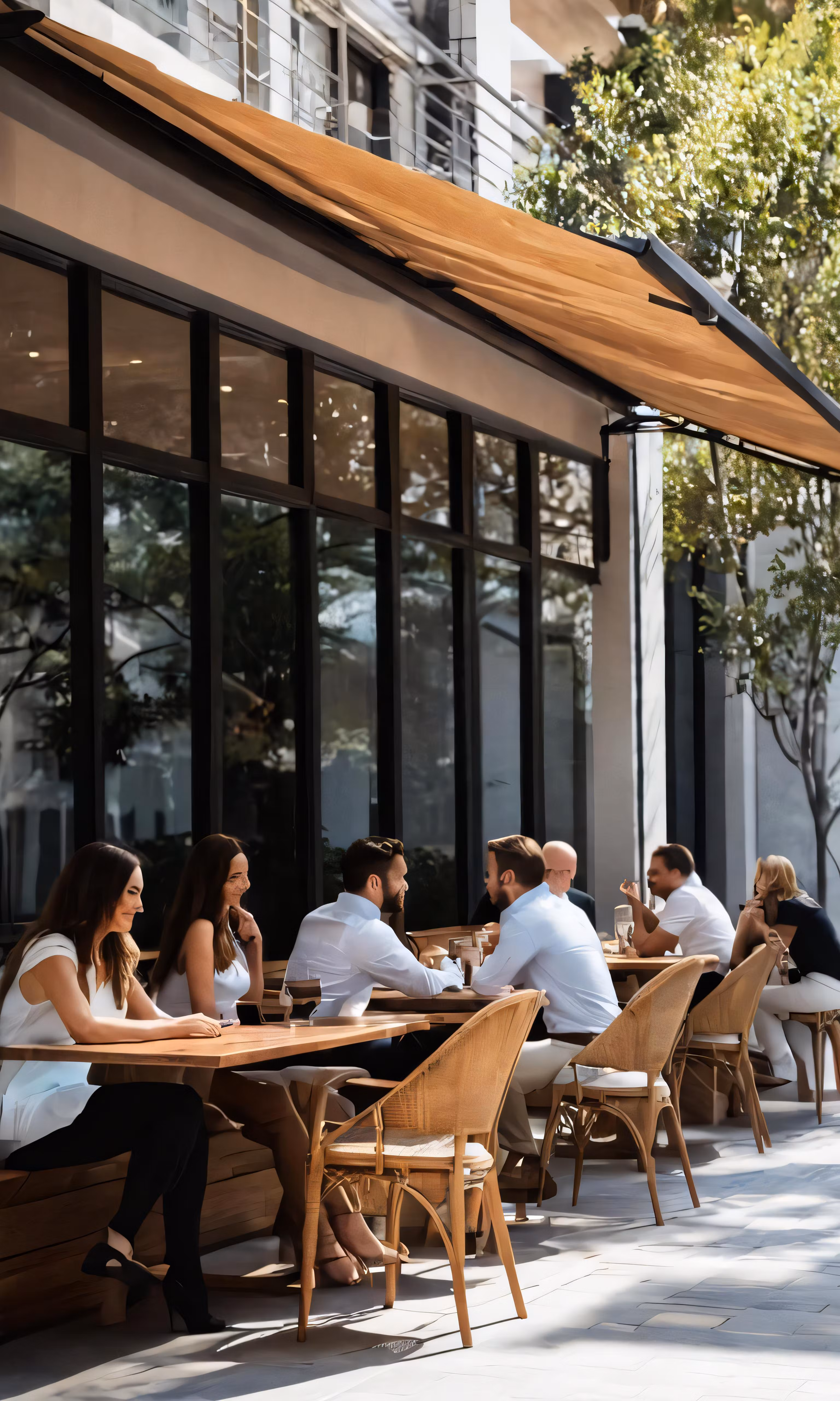 High resolution picture, free to use, people eating outside at outdoor cafe tables on sidewalk