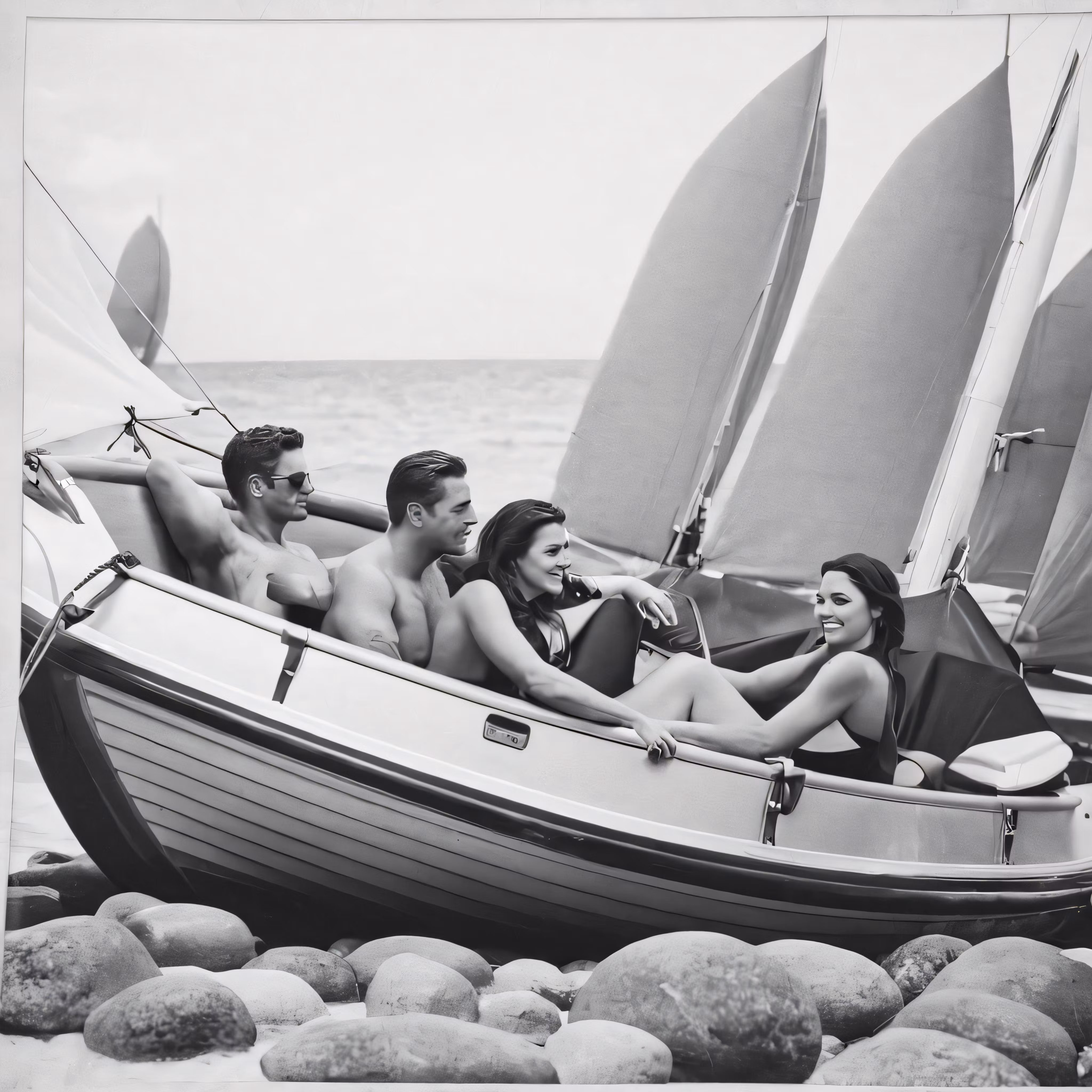 High resolution picture, free to use, people in a sailboat with three people lying in it