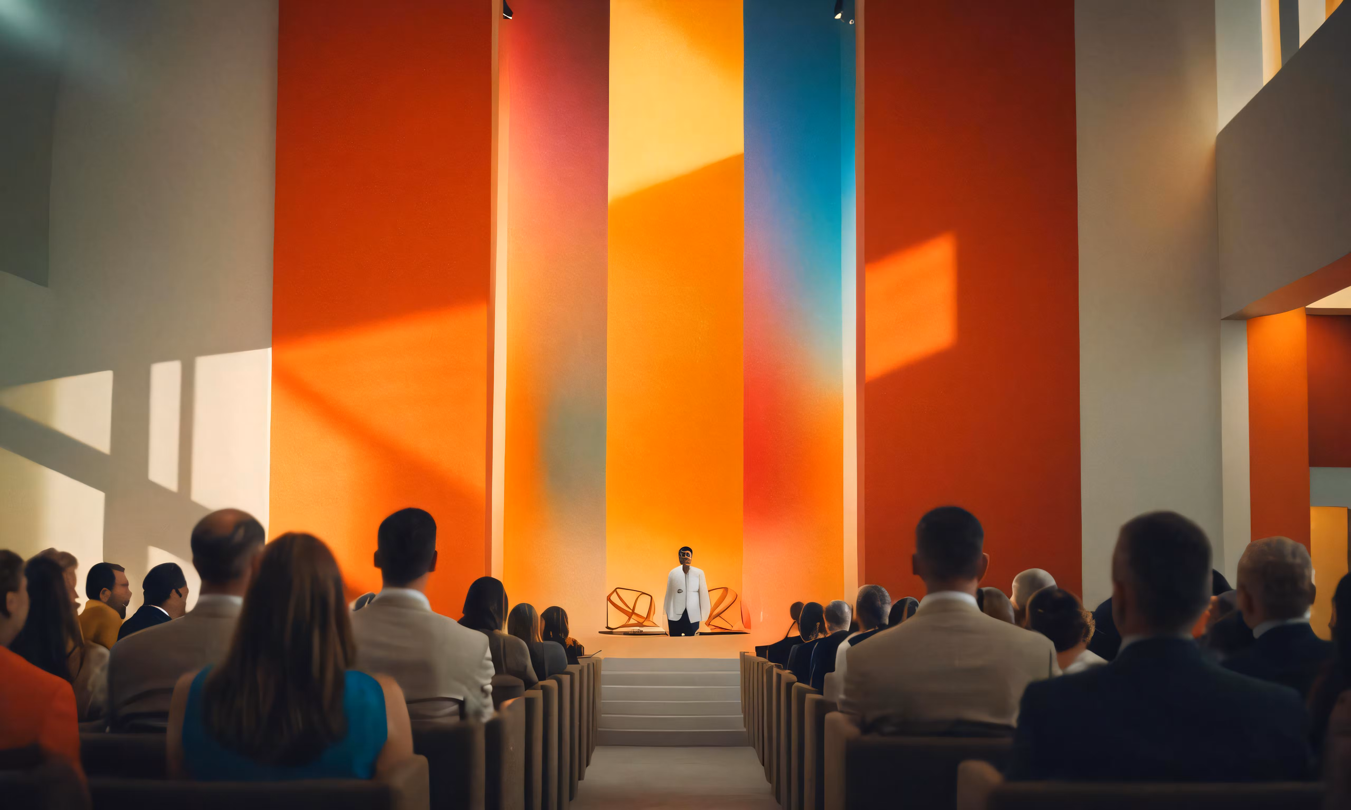 High resolution picture, free to use, people in chairs with a man on stage in front of an audience