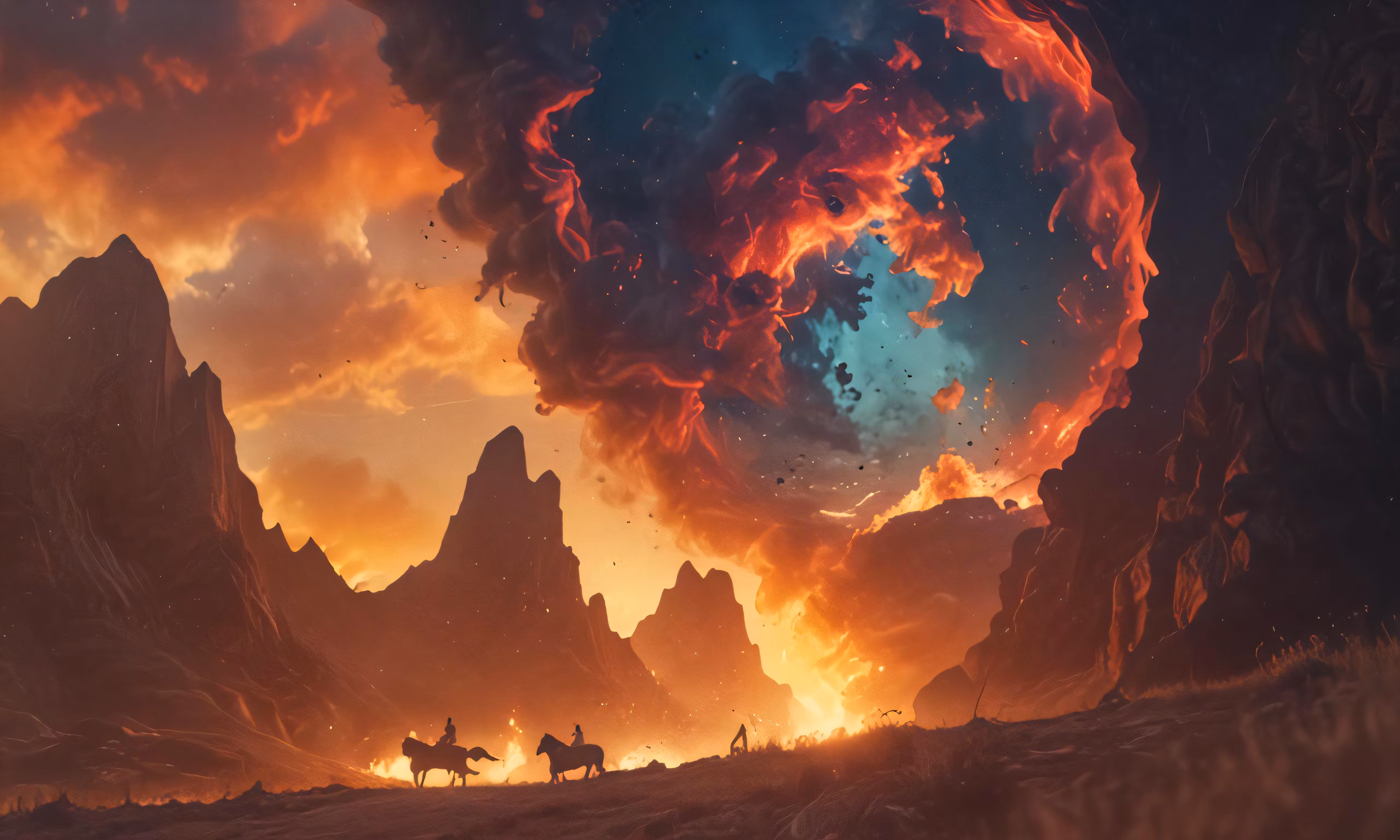 High resolution picture, free to use, people riding horses in a large mountain area with massive clouds