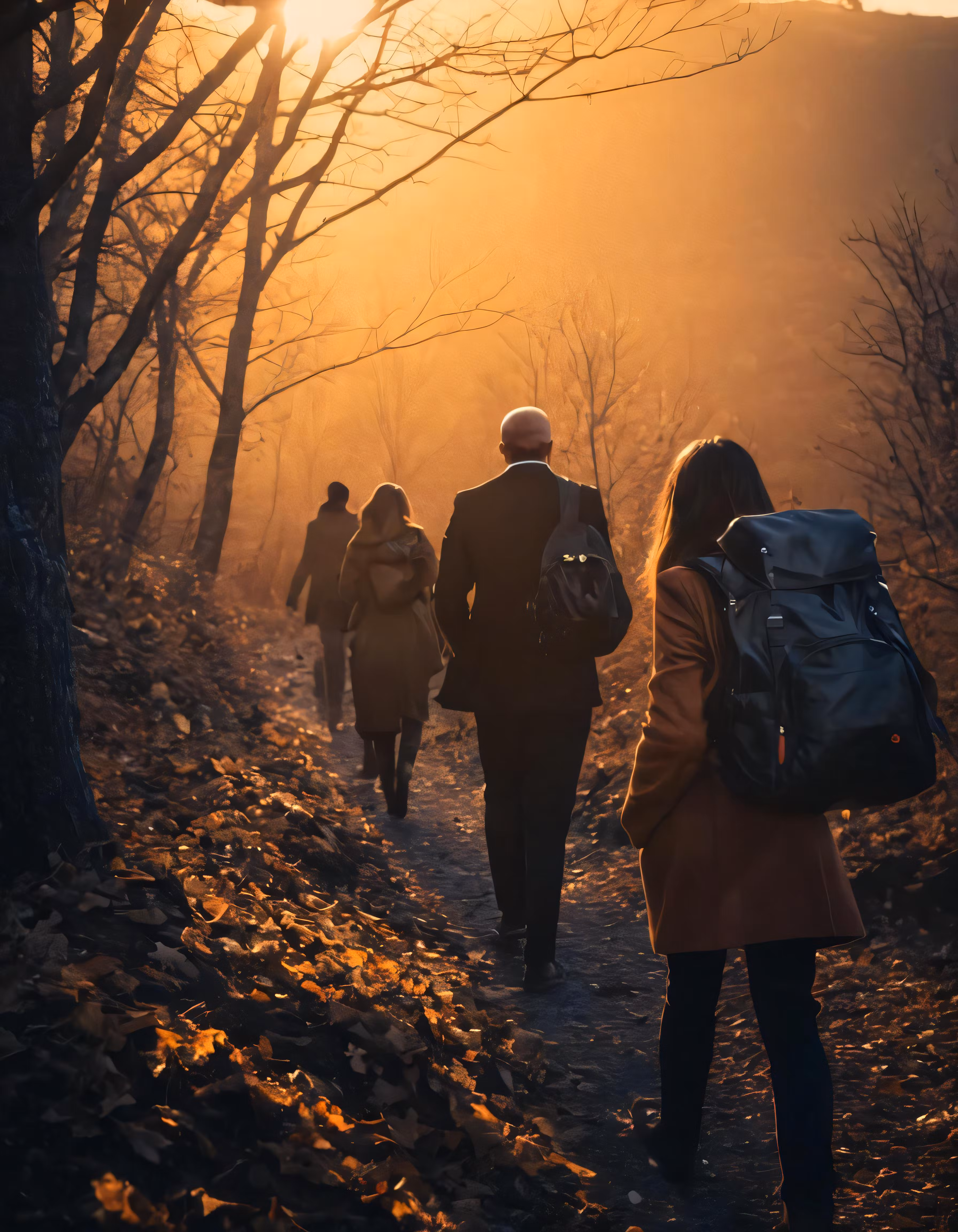 High resolution picture, free to use, people walk down a trail at sunrise while the sun sets