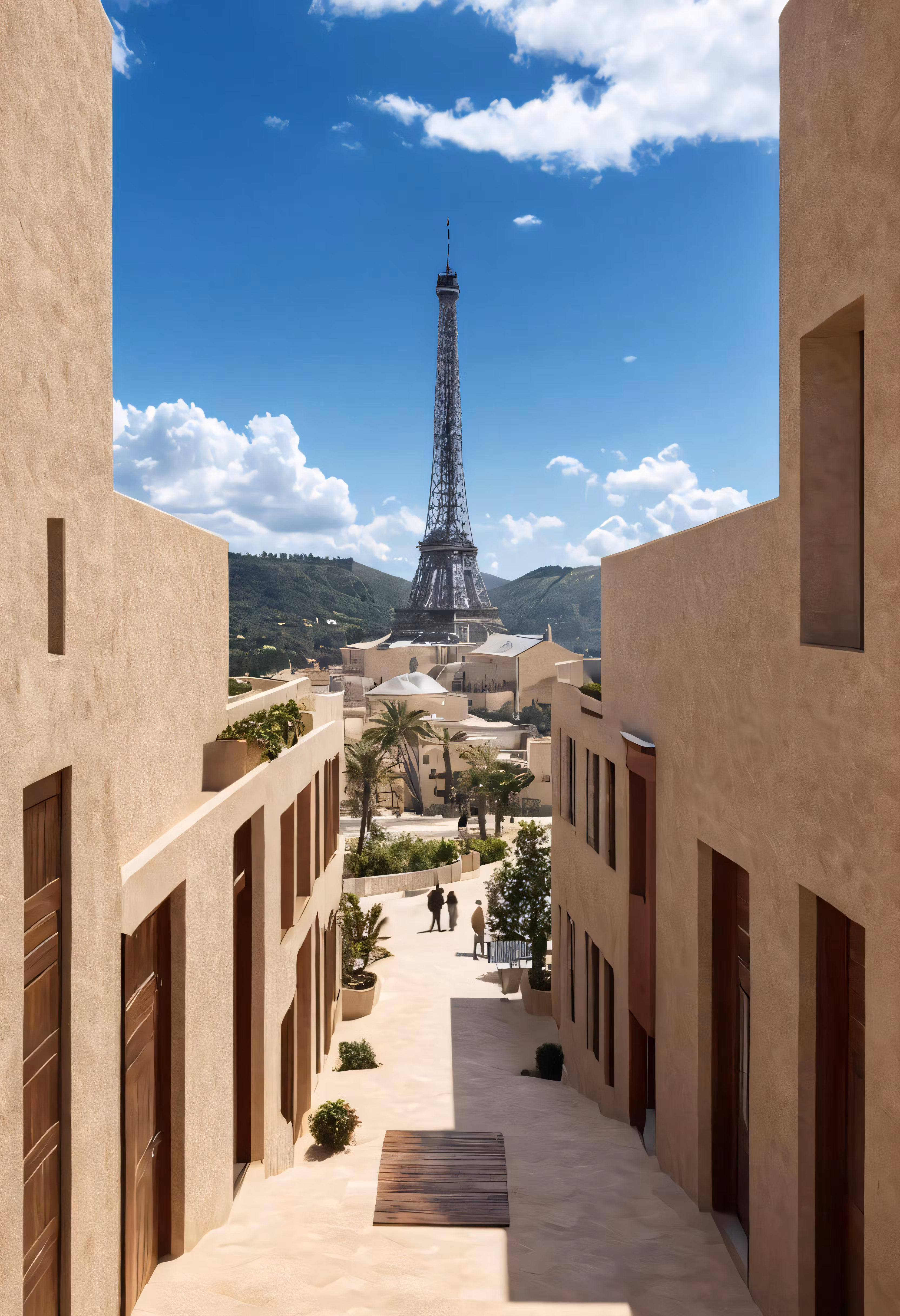 High resolution picture, free to use, people walk on the sidewalk near some buildings with the eiffel tower in the background
