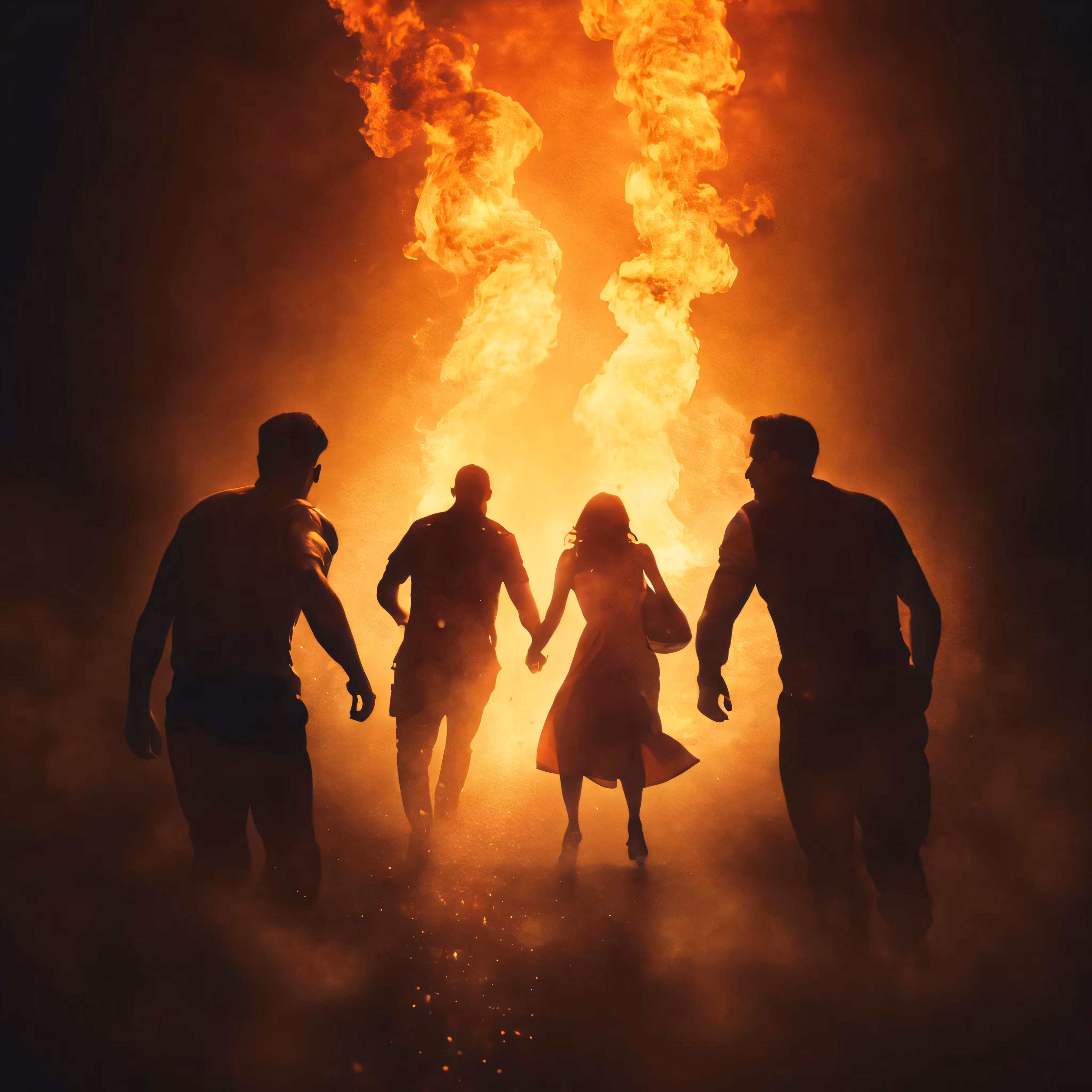 High resolution picture, free to use, people walking in a field of flames in the distance