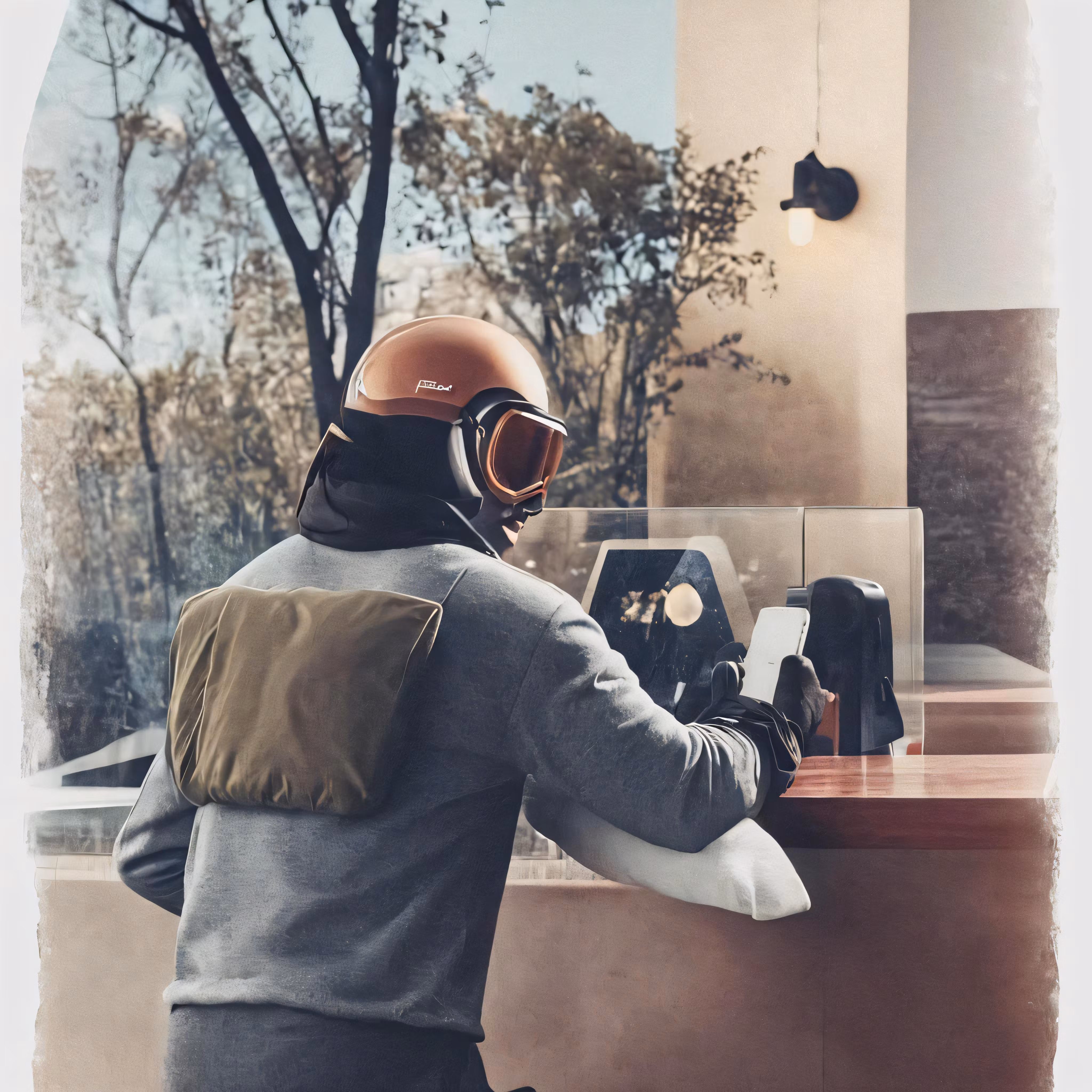 High resolution picture, free to use, person wearing helmet with gloves on standing in front of counter with laptop
