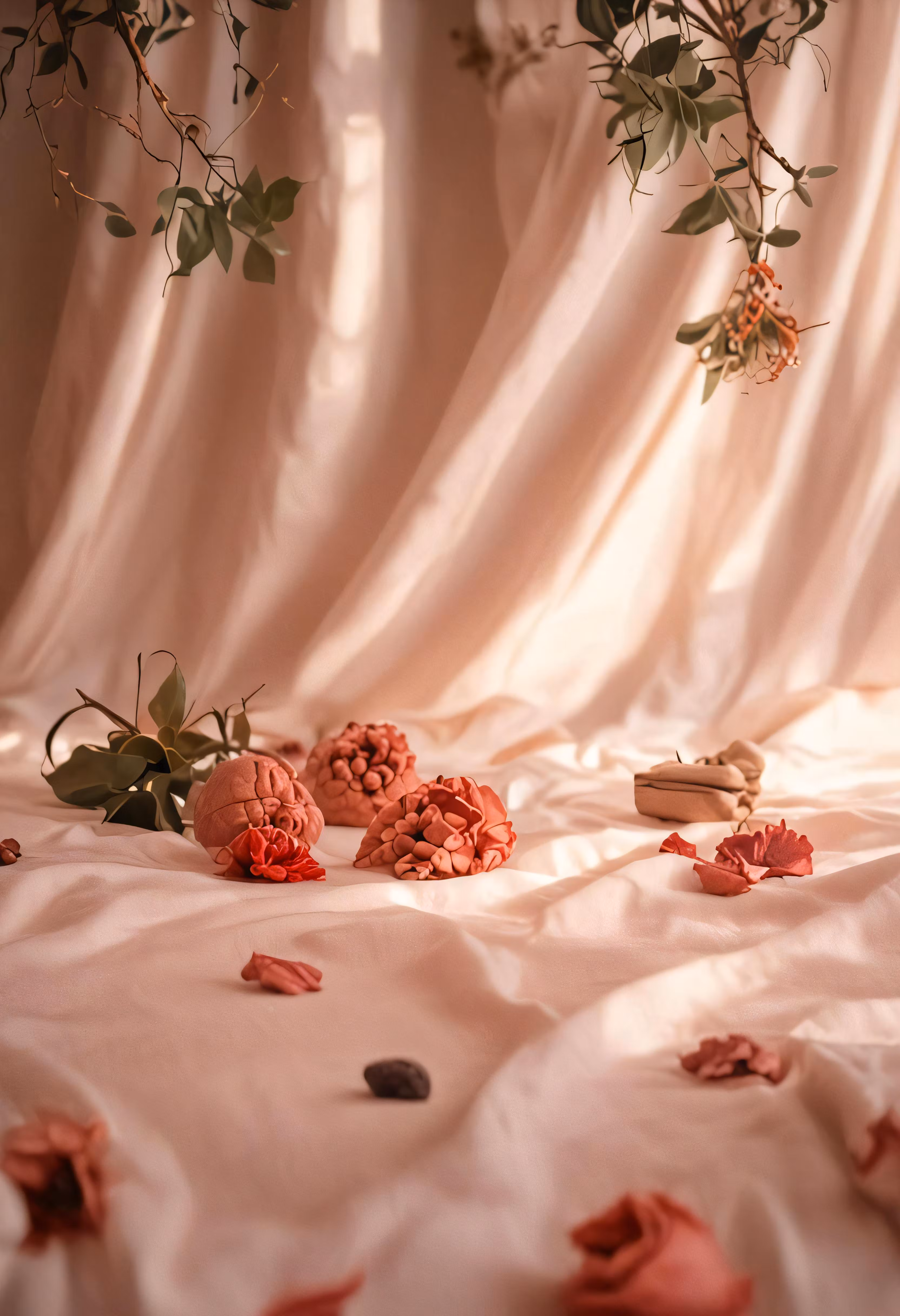 High resolution picture, free to use, pink flowers and books laying on a plain white fabric
