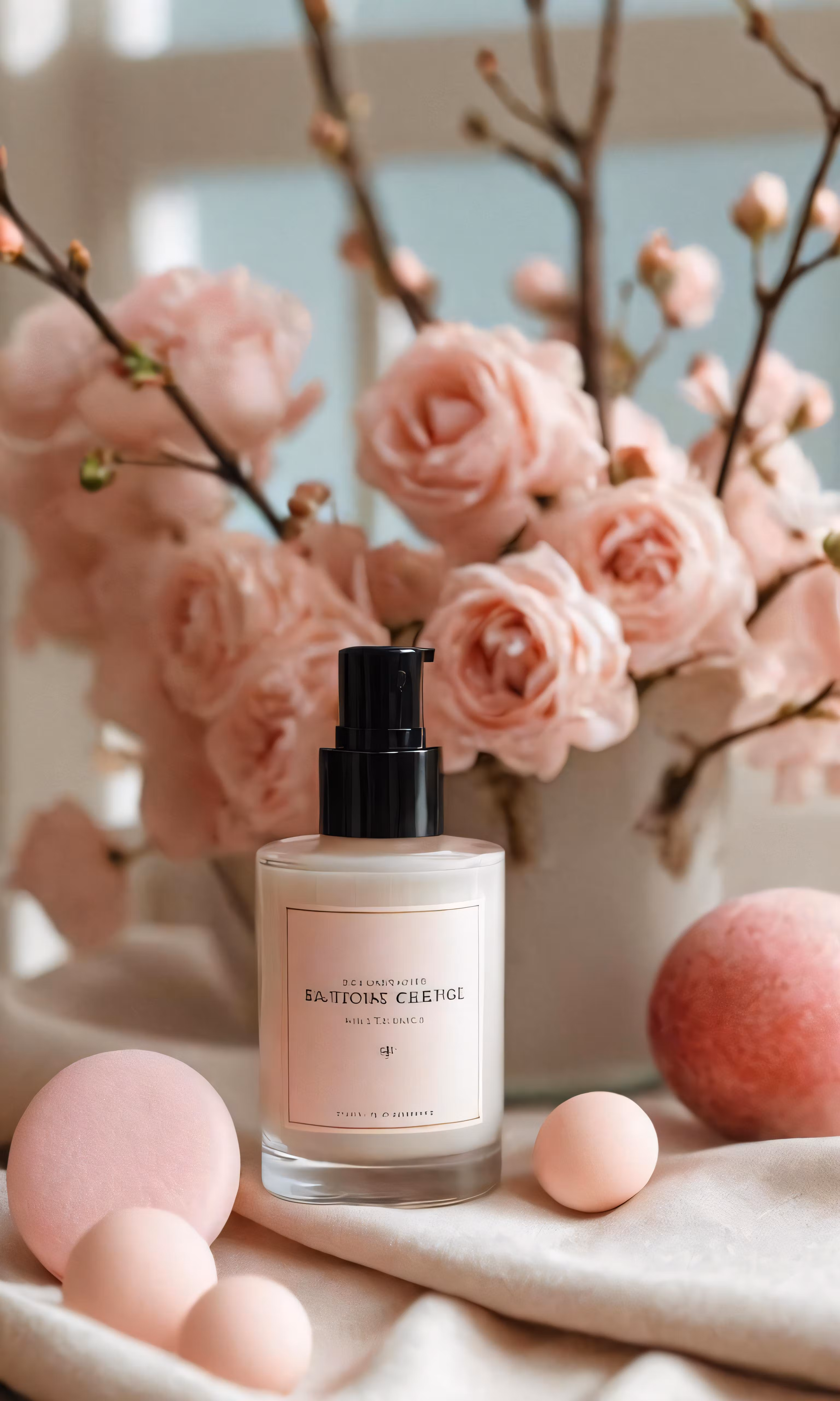 High resolution picture, free to use, pink flowers are in vase next to a candle and soap balls