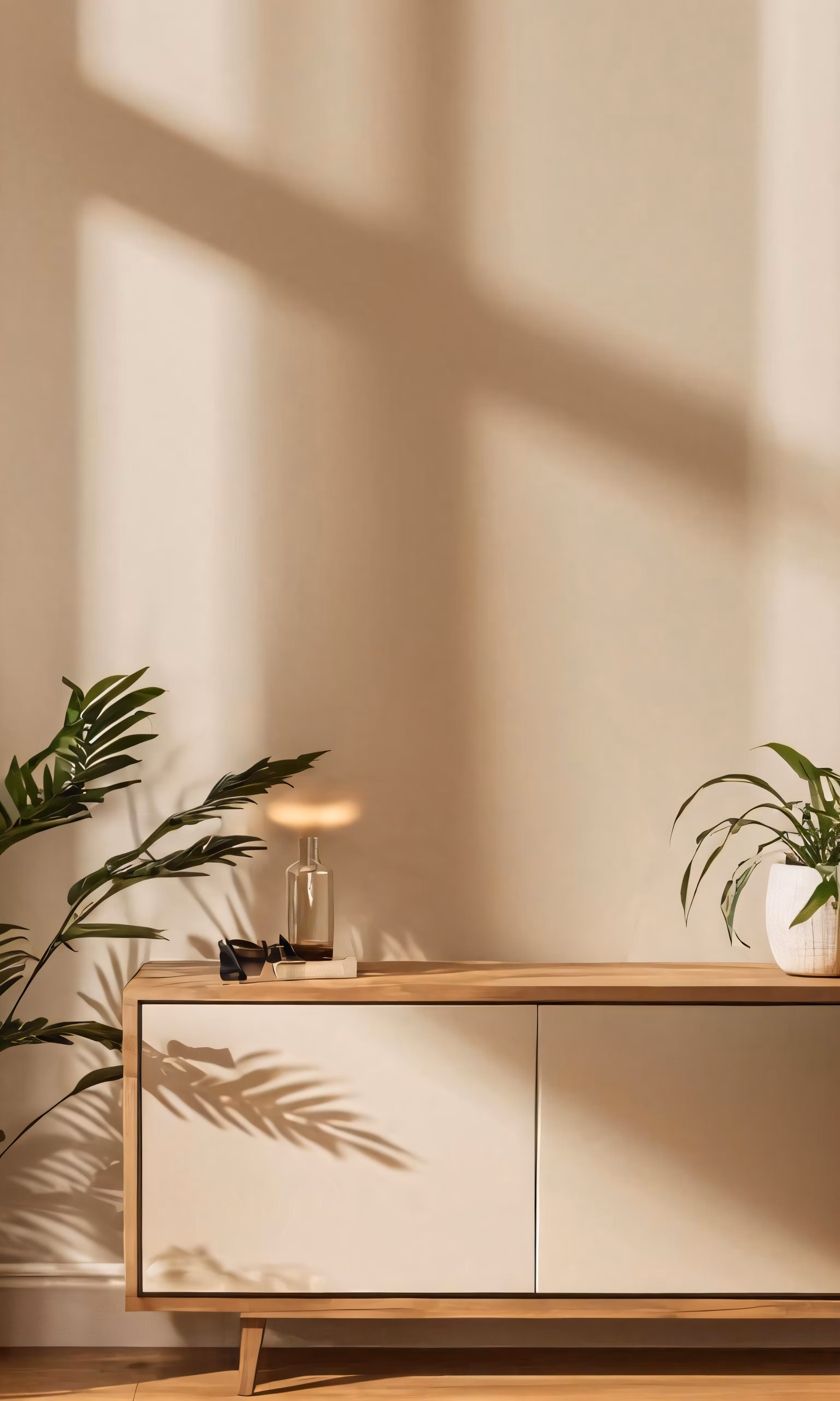 High resolution picture, free to use, plants and lamps on an white sideboard with light from window