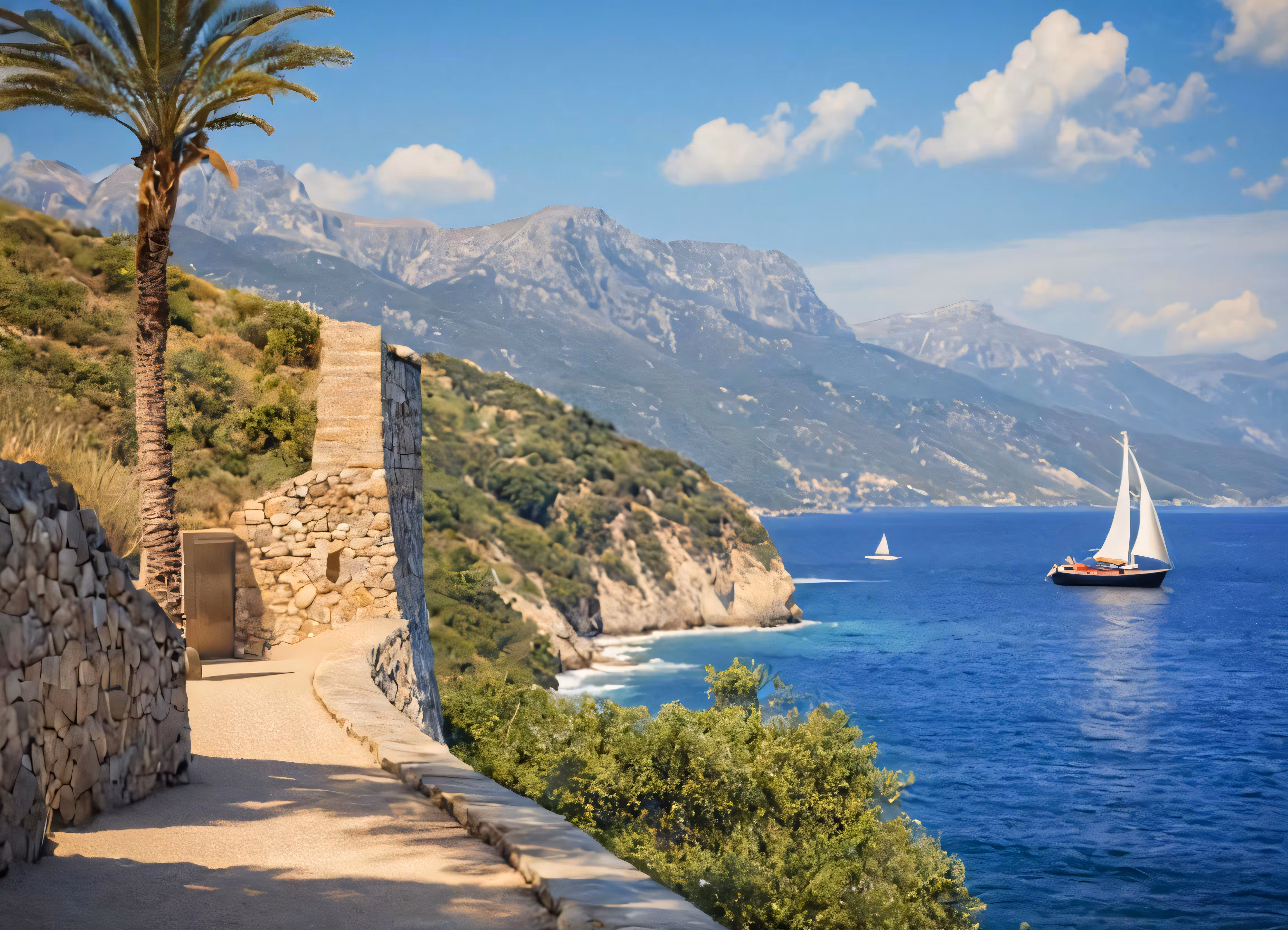 High resolution picture, free to use, sail boats in the ocean near a coastal cliff