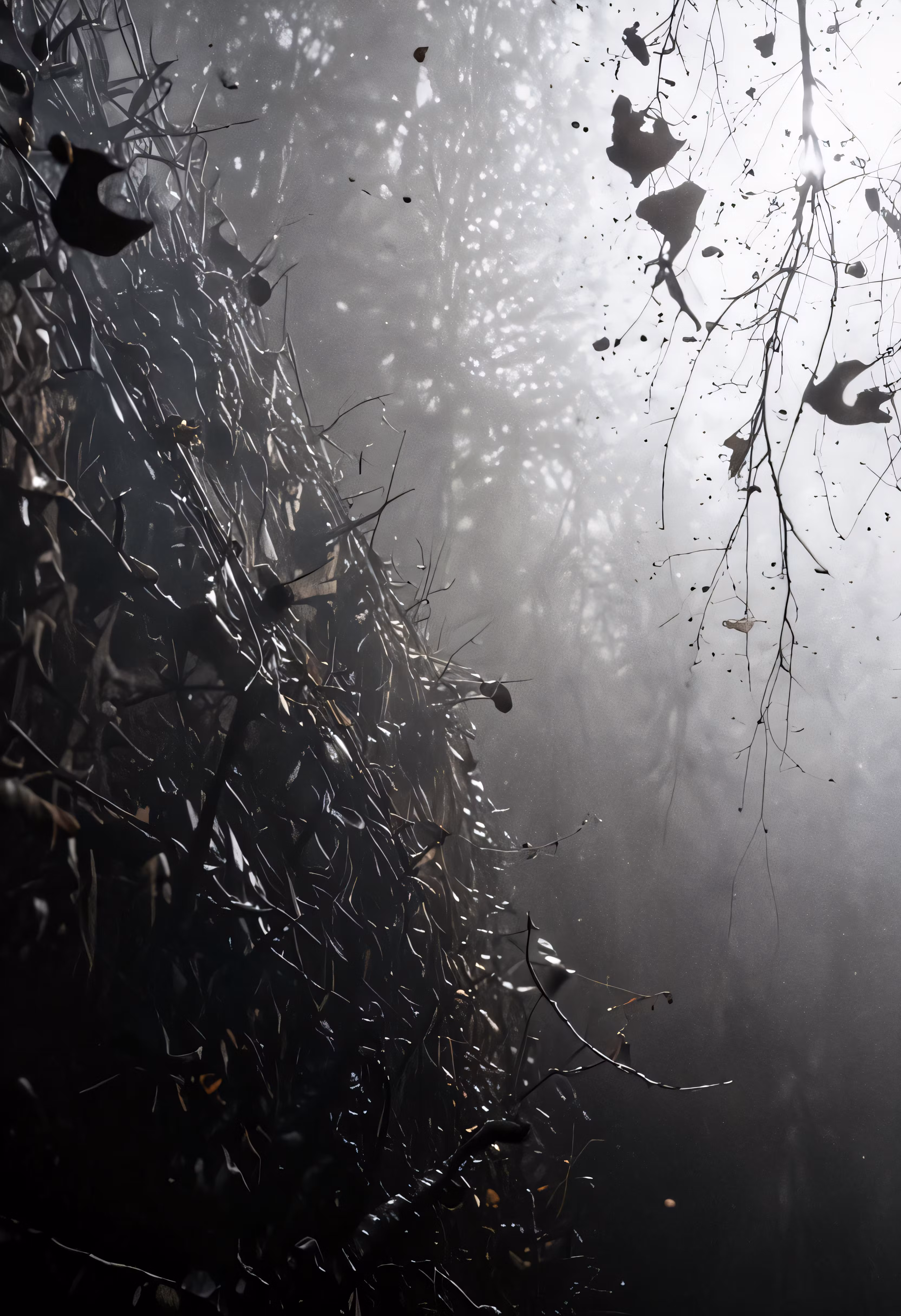 High resolution picture, free to use, several branches with little drops on them in the fog