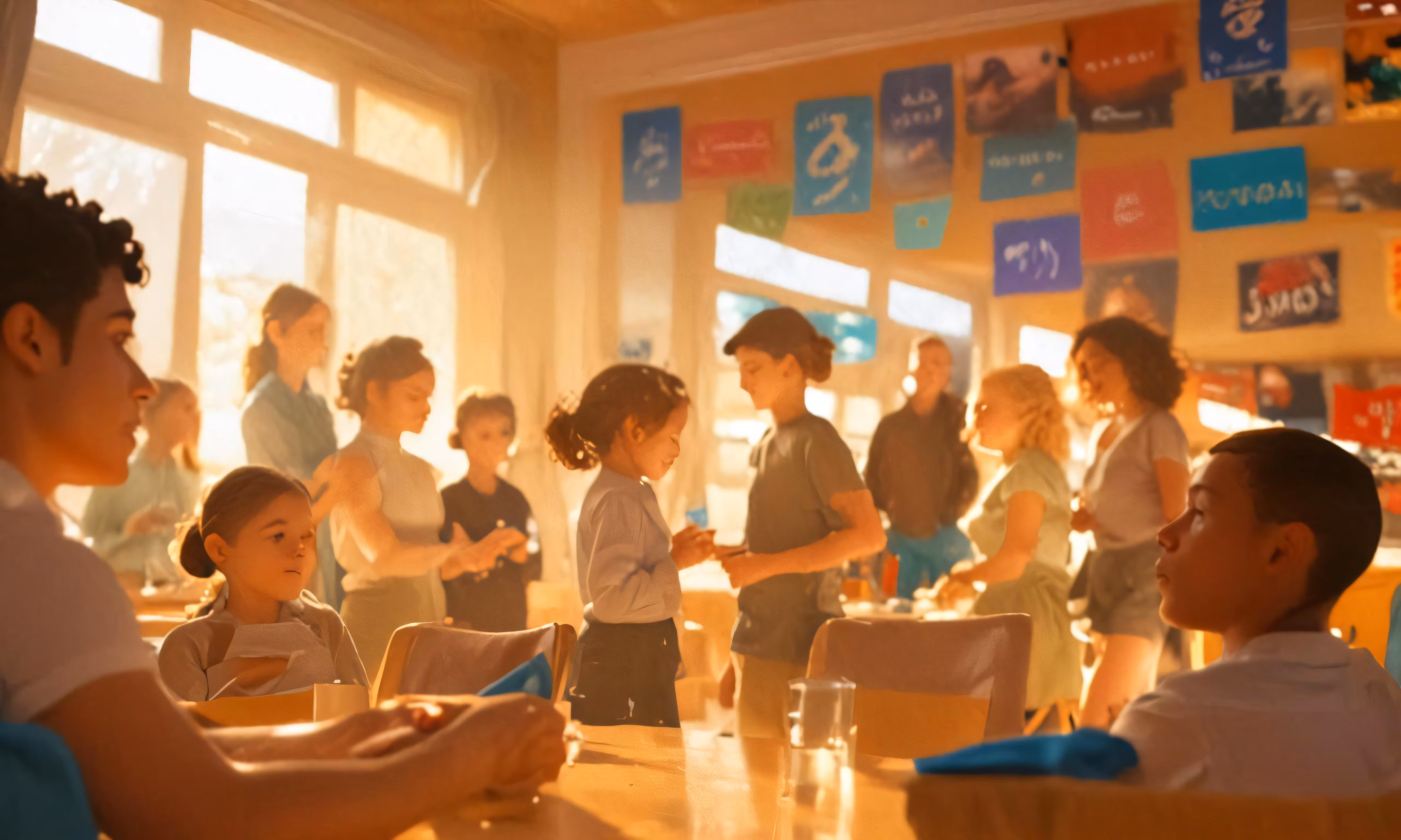 High resolution picture, free to use, several children sitting at a table and a man standing up talking