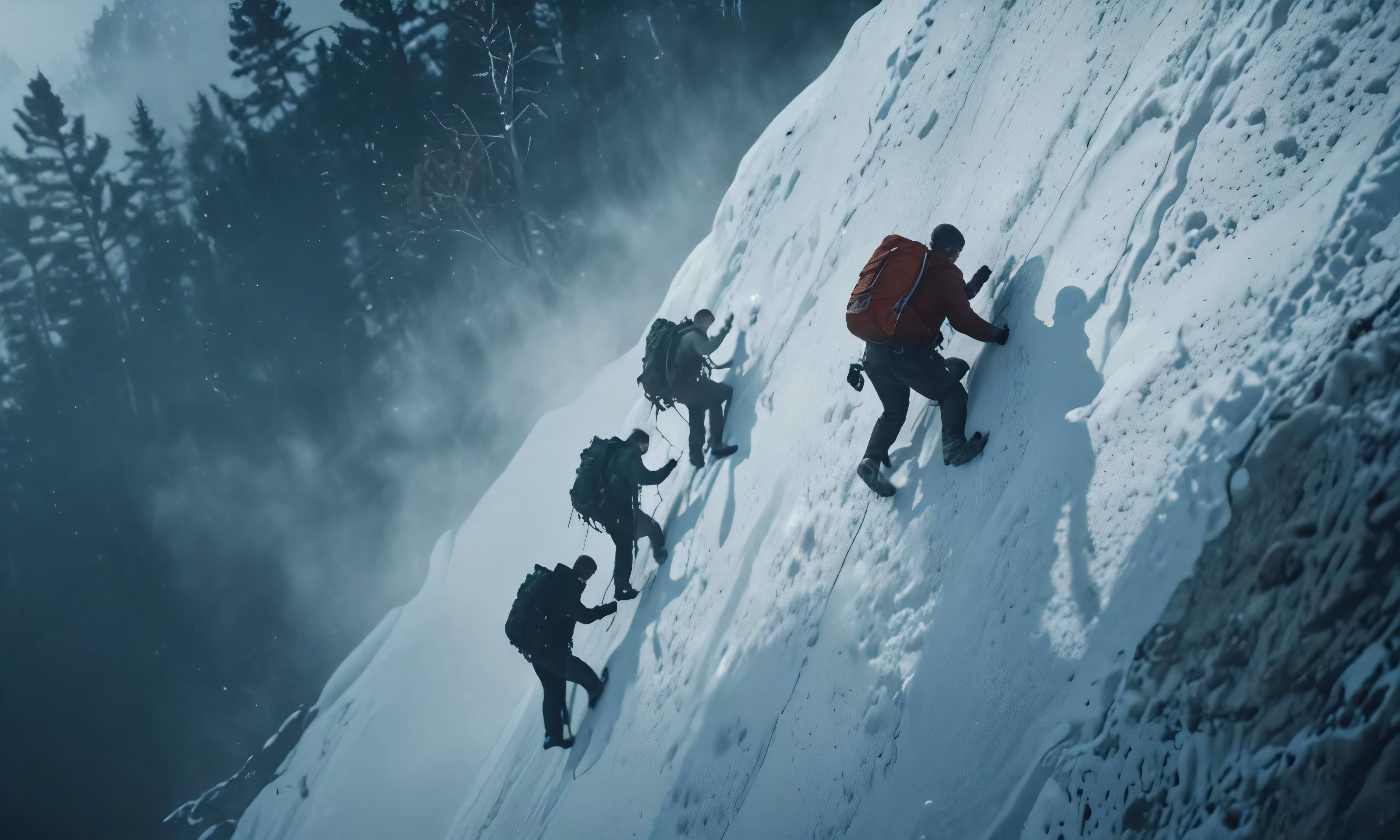 High resolution picture, free to use, several people climbing a steep mountain in the snow