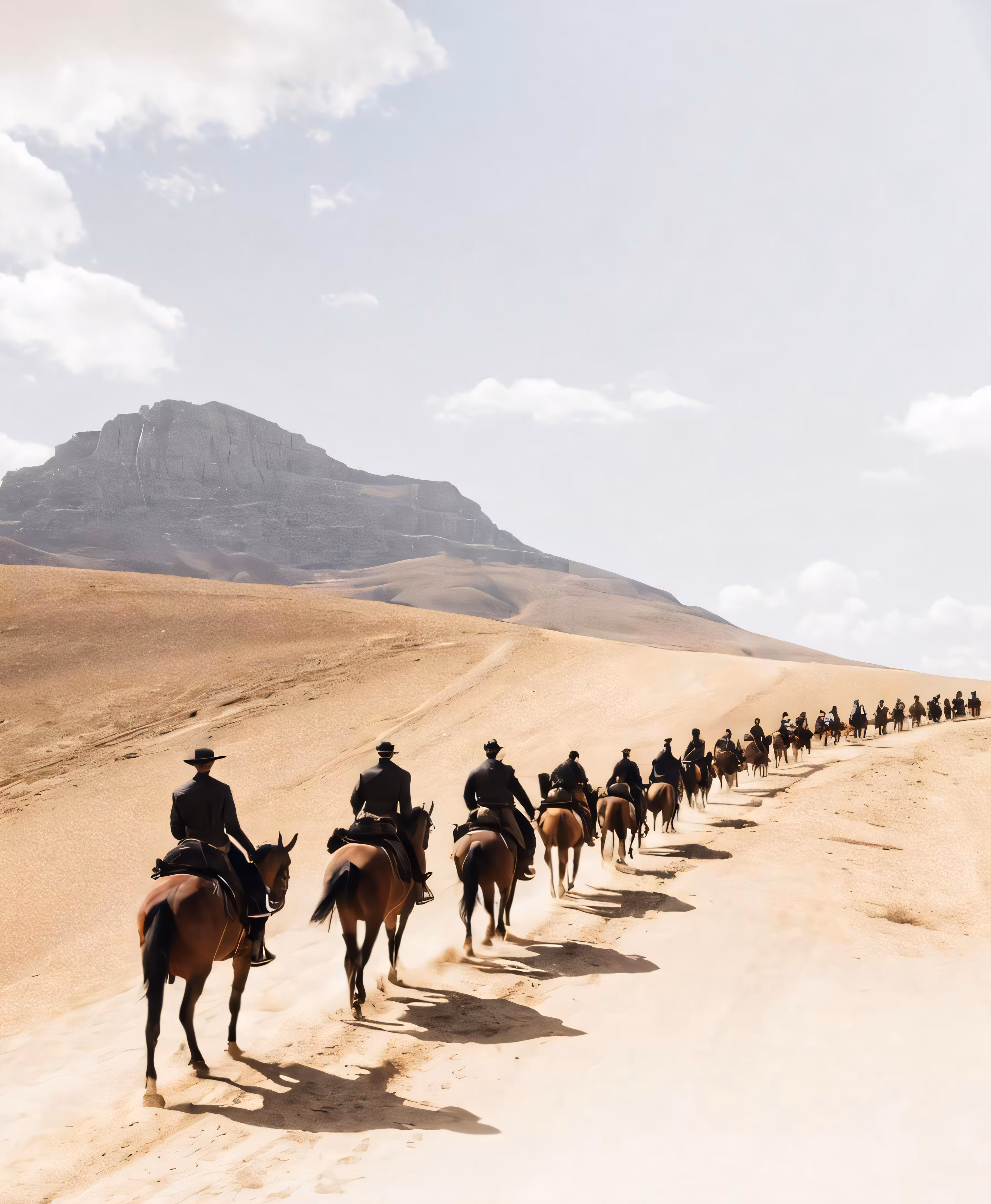 High resolution picture, free to use, several people on horses moving in a line down a dirt path
