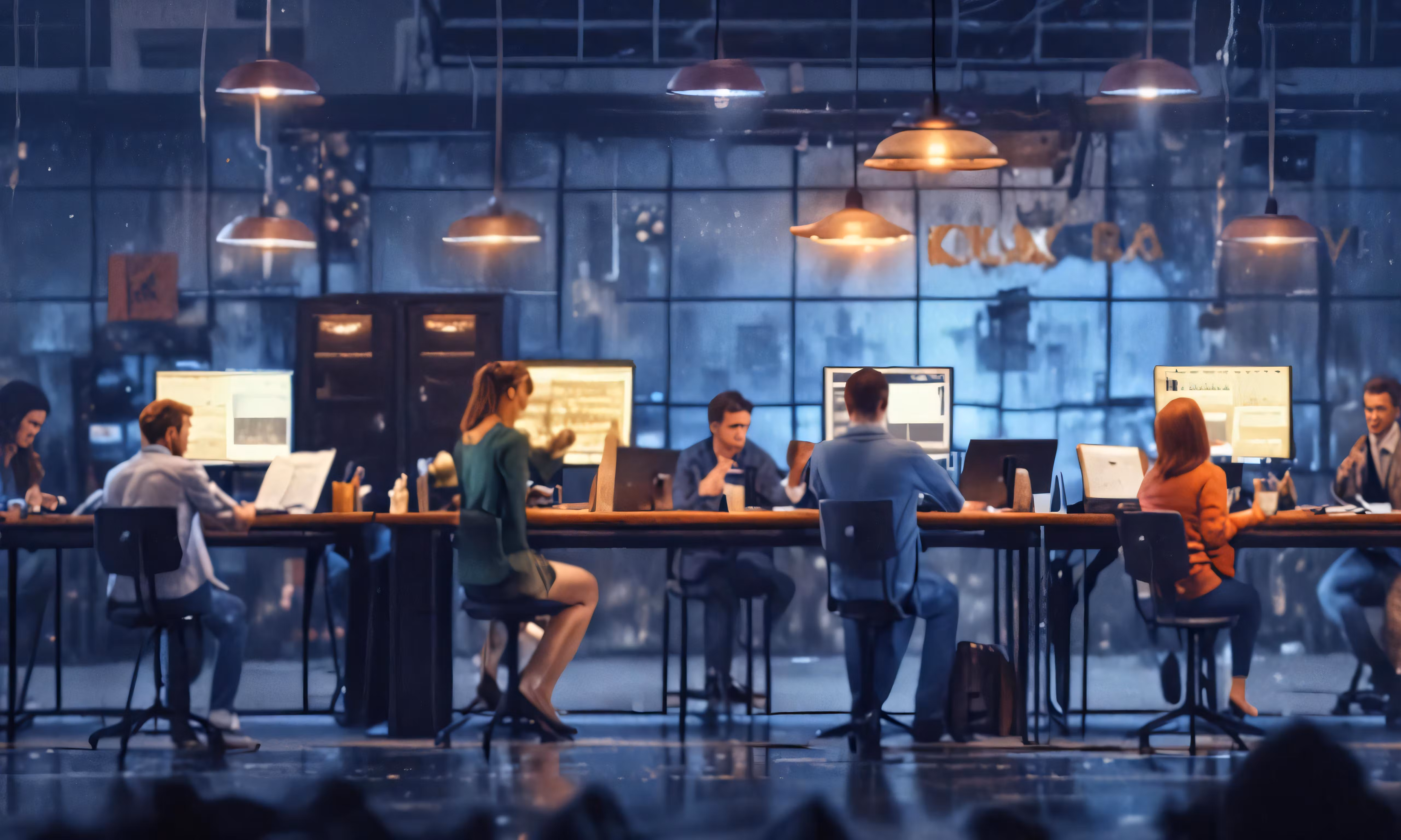 High resolution picture, free to use, several people sitting at desks with computers and their laptops