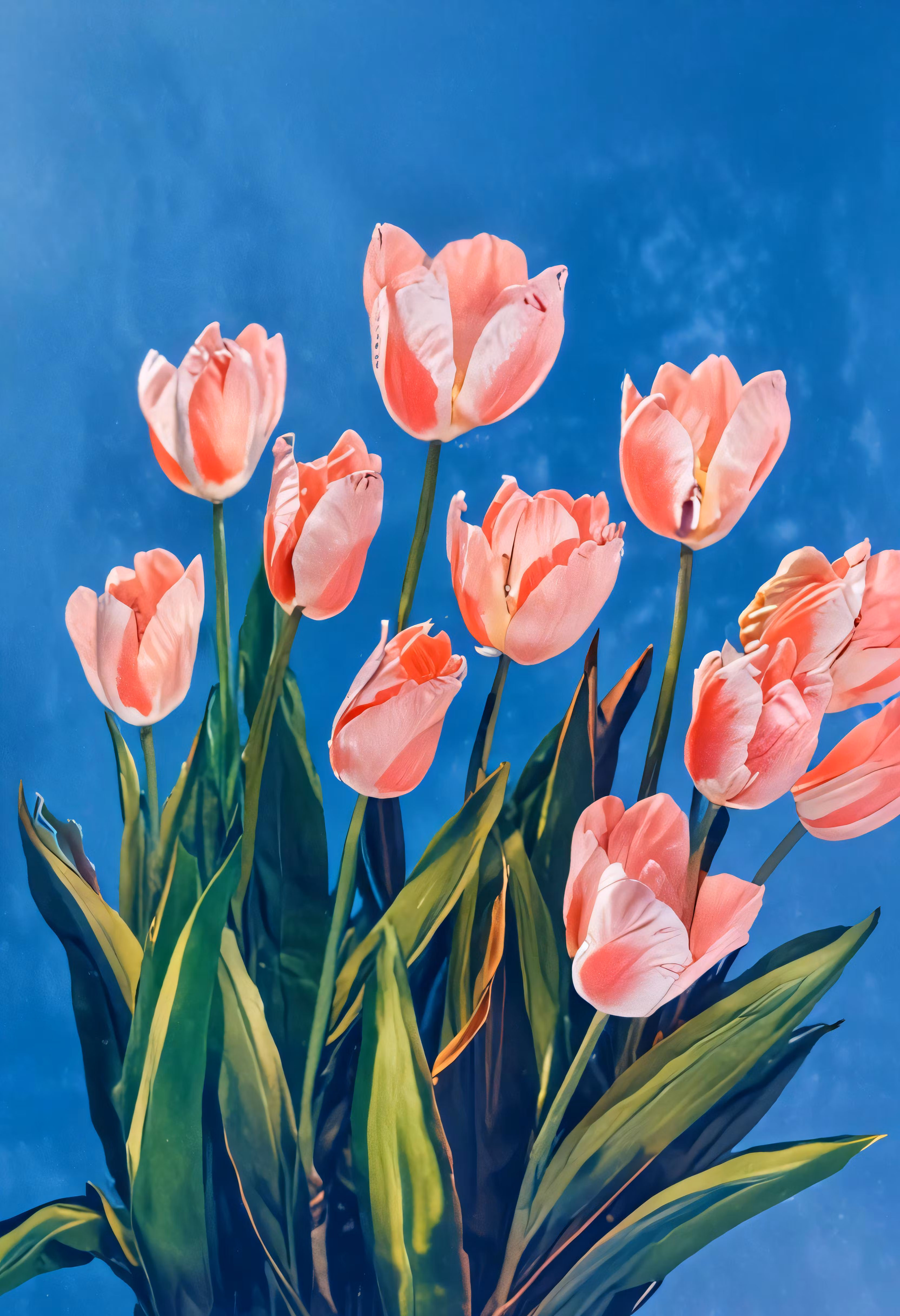 High resolution picture, free to use, several pink tulips are in a blue vase on the table