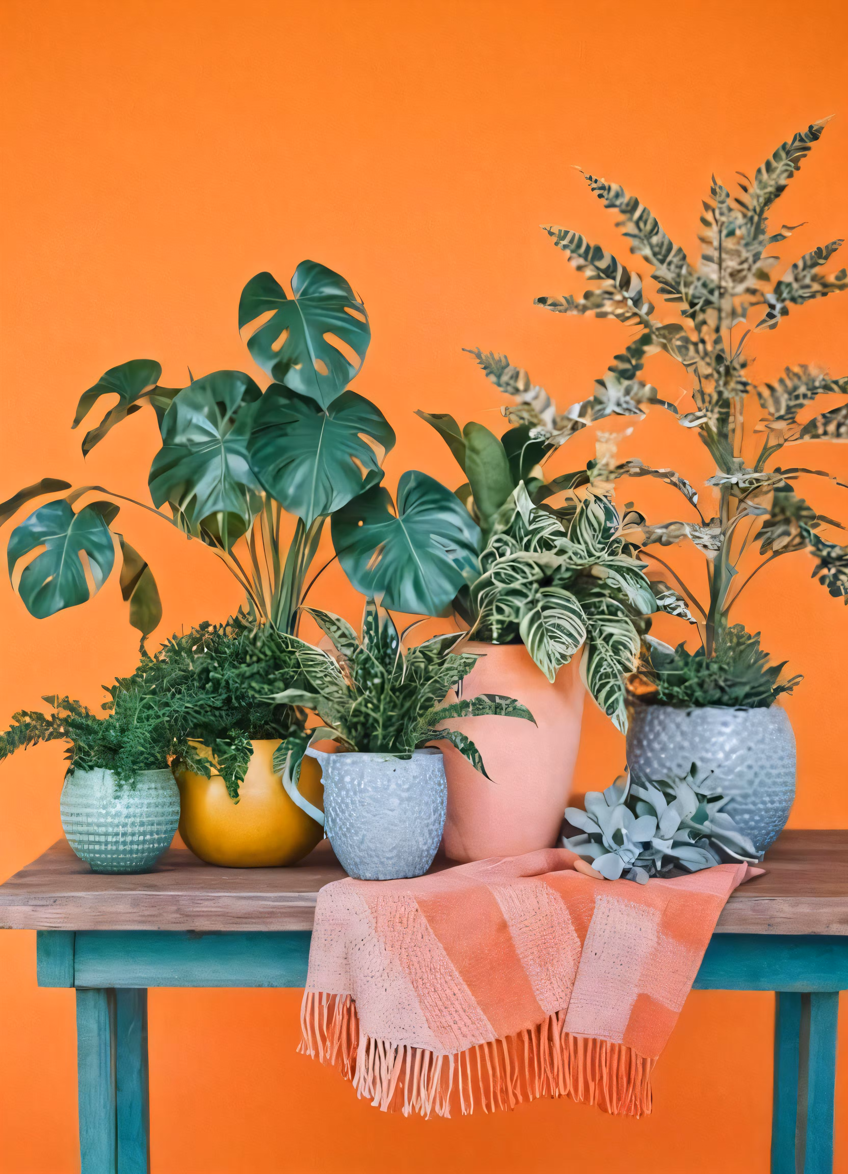 High resolution picture, free to use, several planters on a wooden table with orange wall in the background