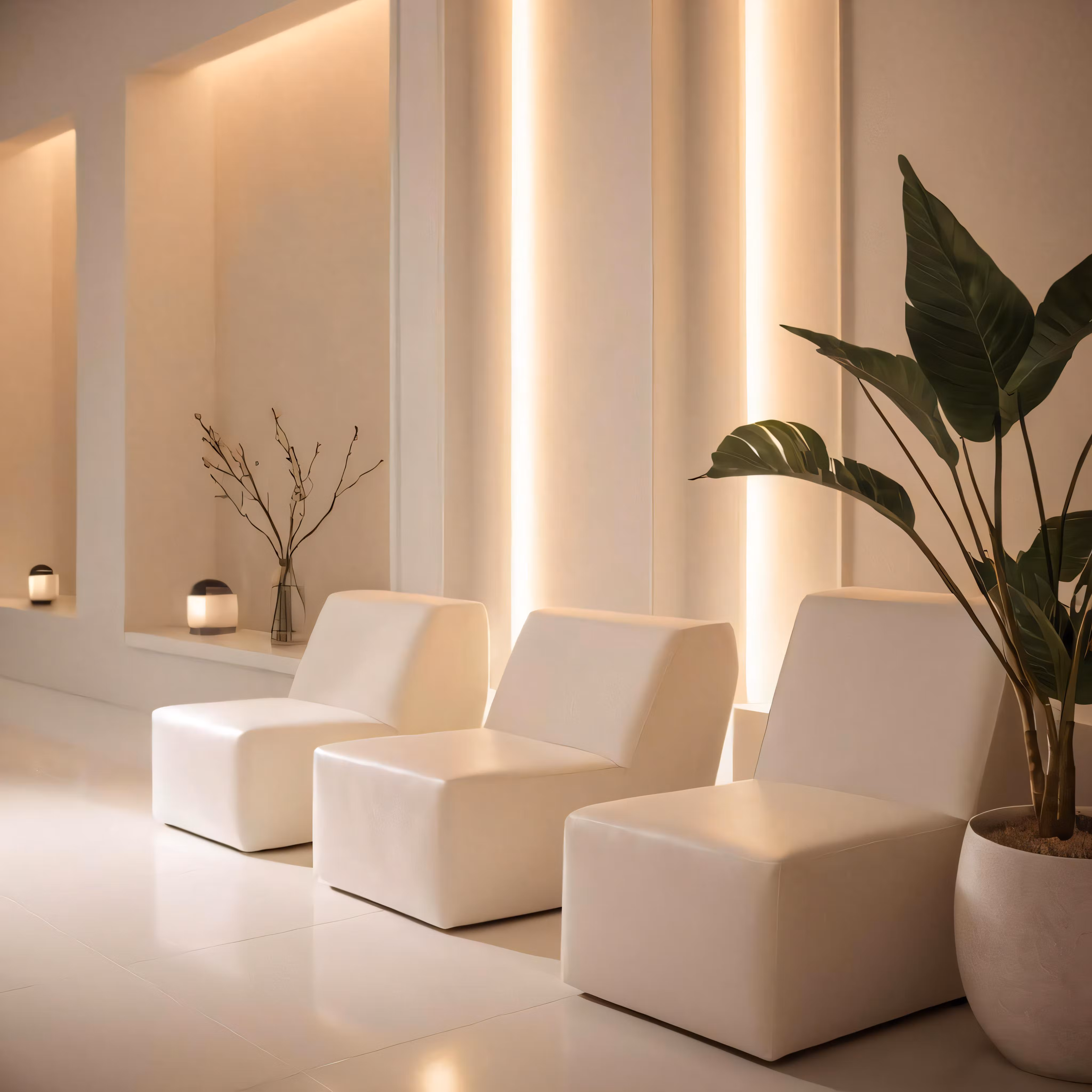 High resolution picture, free to use, several white furniture and a potted plant in front of a wall with dim lighting