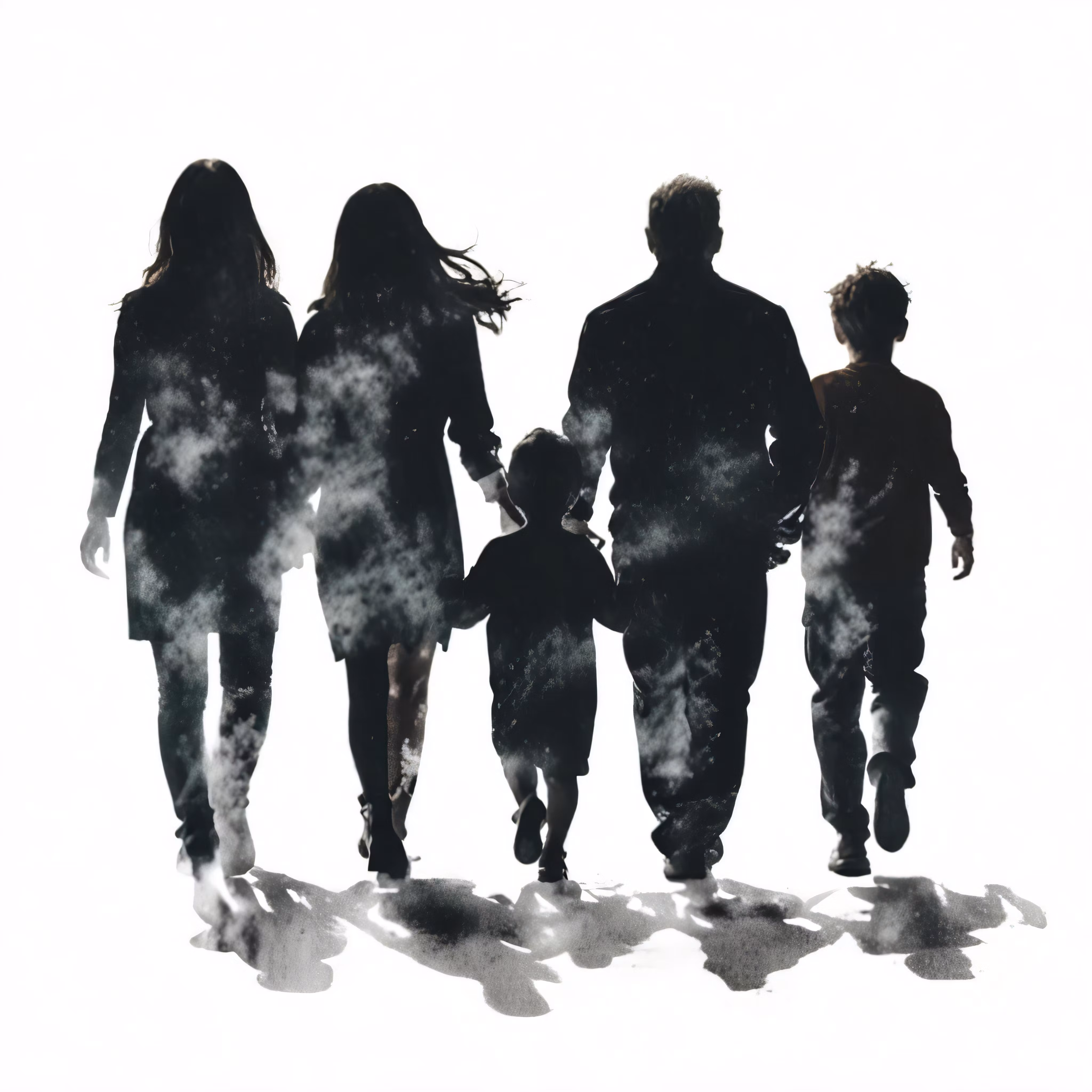 High resolution picture, free to use, silhouettes of two adults and a child walking on a white surface
