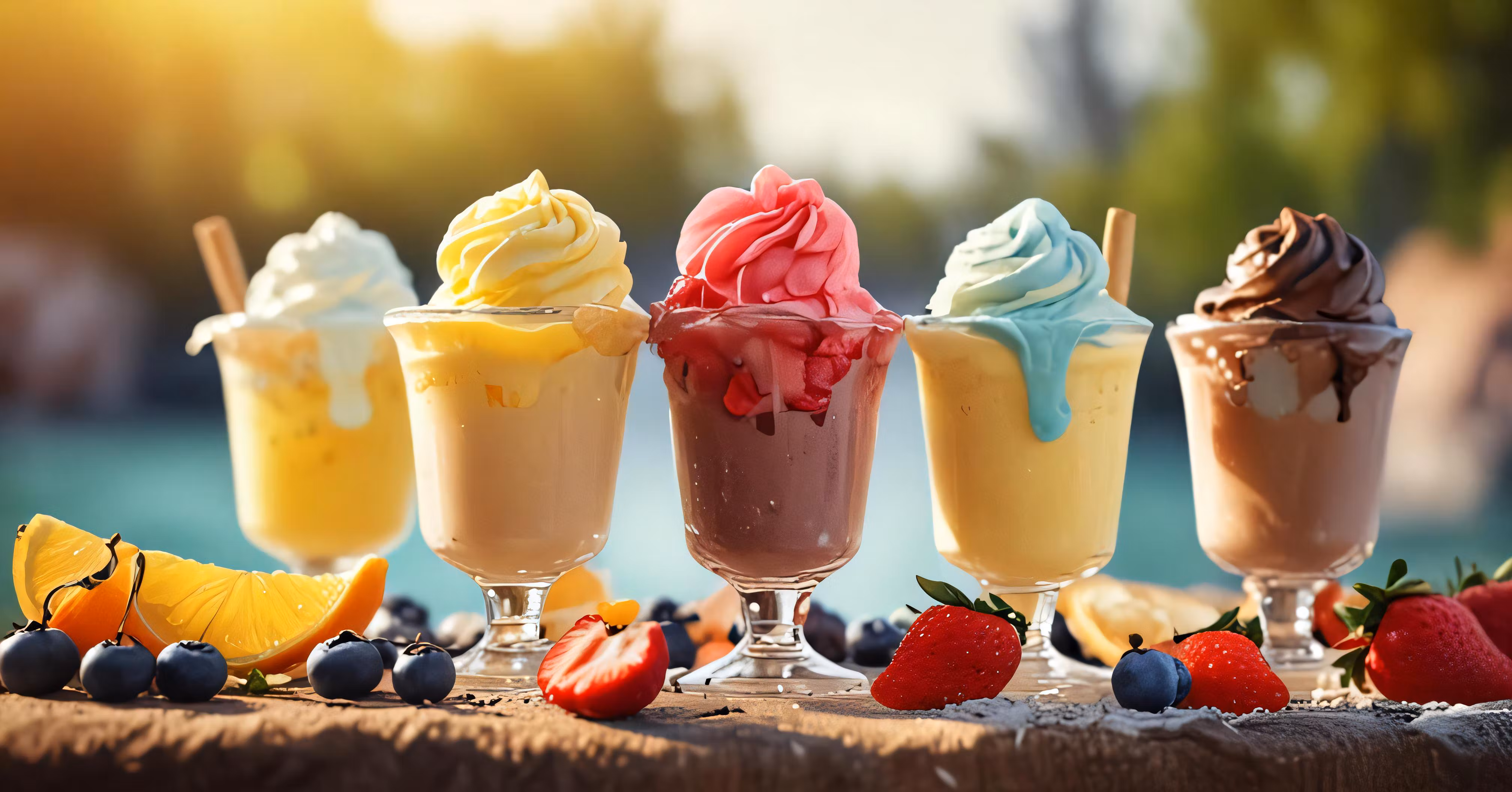 High resolution picture, free to use, six ice cream and dessert sundaes, next to each other