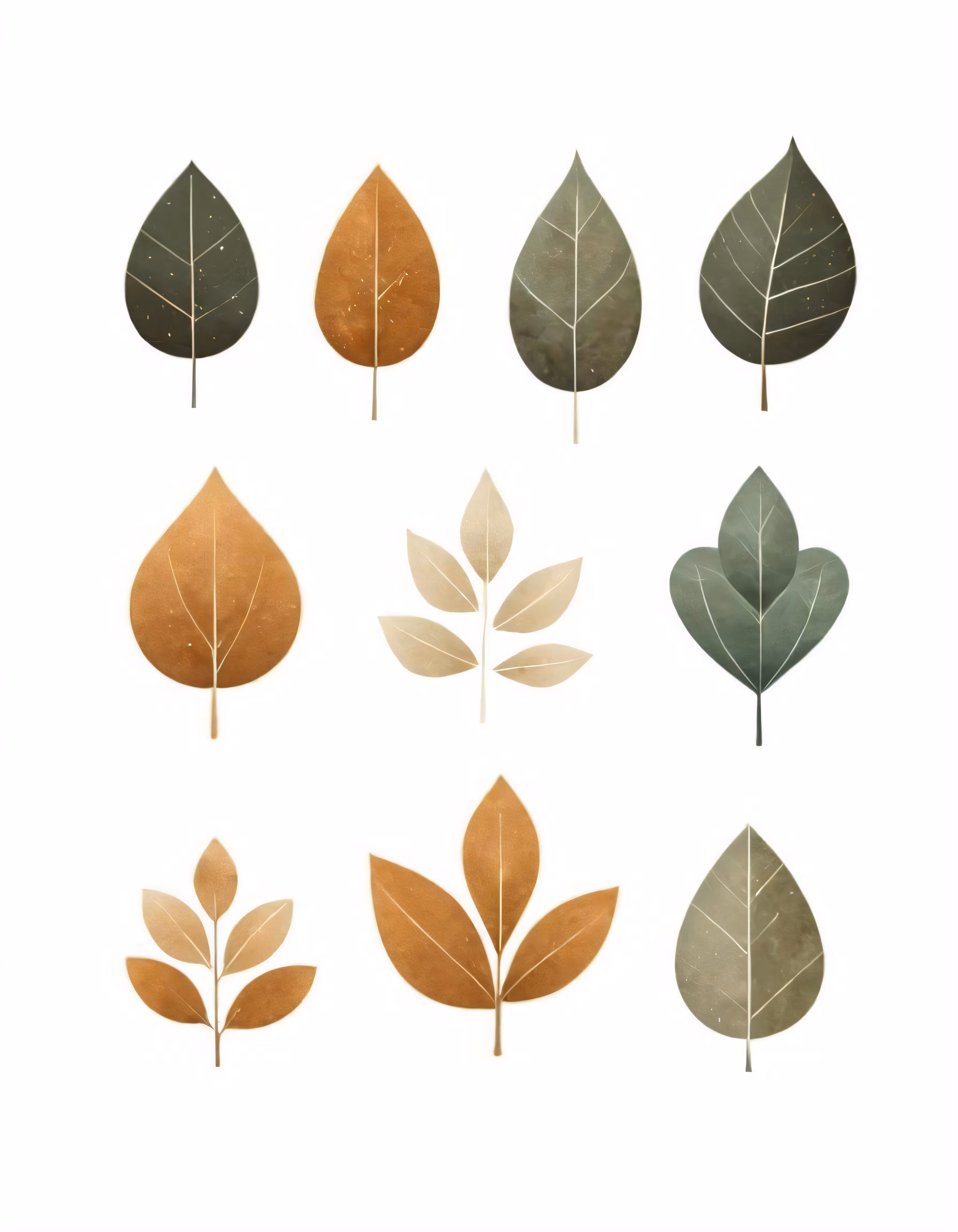 High resolution picture, free to use, six pressed leaves arranged in shades and sizes on white